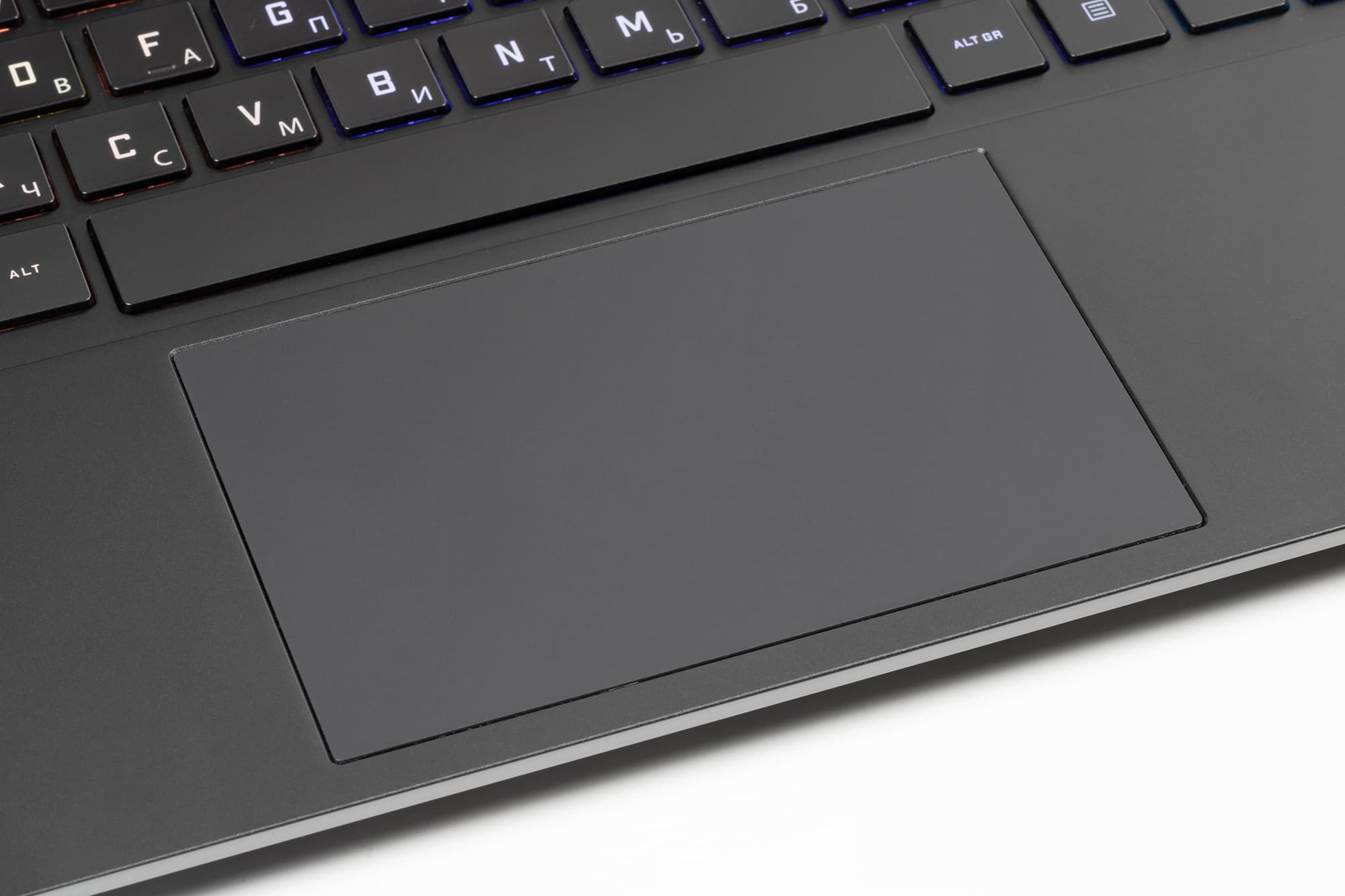 На рабочей поверхности за клавиатурой есть секция с очень мелкими вентиляционными отверстиями, а перед ней — тачпад (кликпад), но безусловно, самое интересное здесь — сама клавиатура.