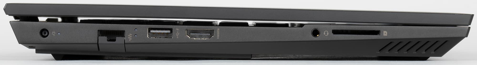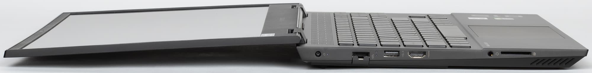 Боковины корпуса сильно скошены в нижней части, из-за этого при взгляде сбоку сверху создается впечатление, что у ноутбука тонкий клиновидный корпус. Но из-за этого же на левой боковине не уместился по высоте стандартный разъем RJ-45, пришлось делать его с откидывающейся подпружиненной крышкой. Также на левом боку можно найти разъем питания под фирменный круглый в сечении штекер, порт USB3 Gen1 с поддержкой зарядки мобильных устройств от выключенного ноутбука, видеовыход HDMI, универсальный миниджек для подключения гарнитуры или наушников и разъем для карт SD.