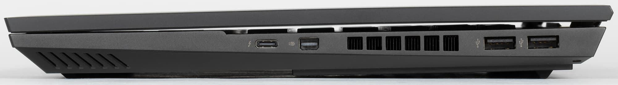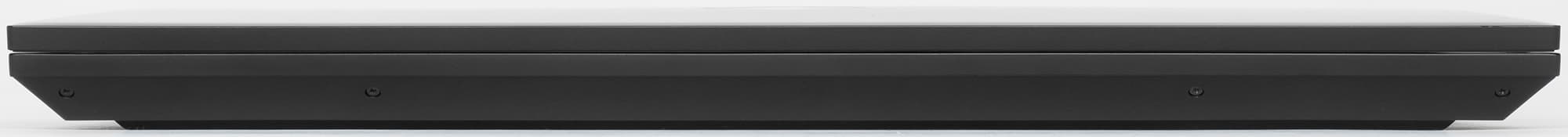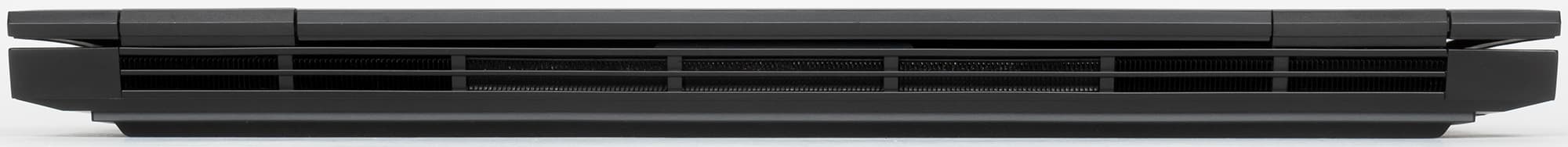 Нагретый воздух кулеры выдувают назад и направо, причем направо — не в самой задней части корпуса. Задняя панель отдана под вентиляцию целиком, интерфейсных разъемов тут нет, вся задняя стенка перфорирована. На переднем торце ноутбука ничего нет.