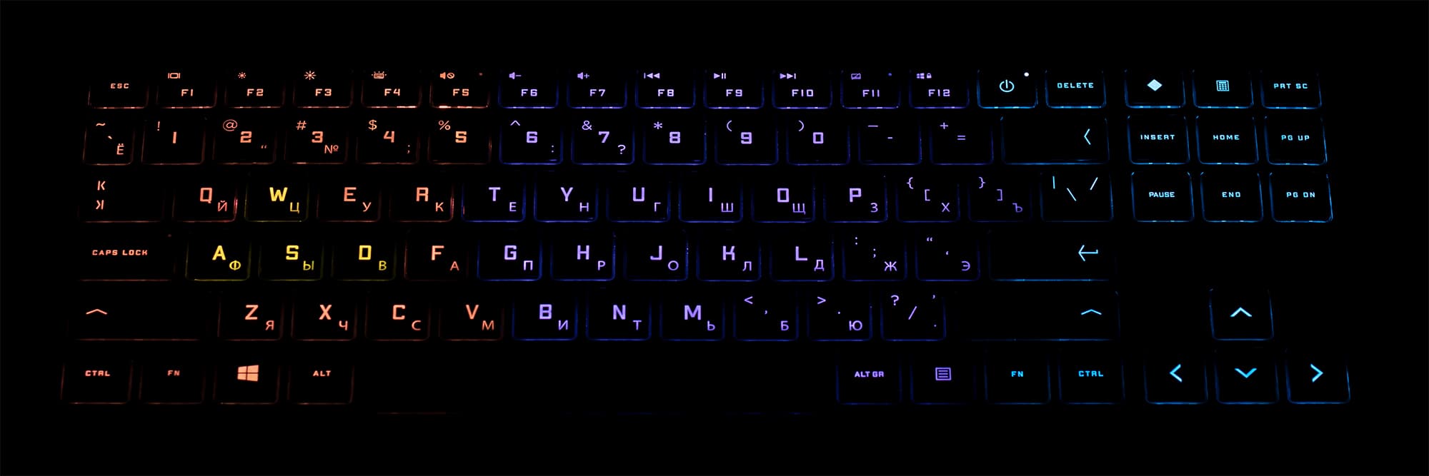 Она совершенно нетипичная: нет цифрового блока, однако имеется почти стандартный блок клавиш для редактирования текста, в том числе полноразмерные и обособленные стрелочки. Если бы не мощная и дорогая видеокарта, мы бы рекомендовали этот ноутбук всем, кому требуется много работать с текстом, потому что для этой цели такая раскладка идеальна. Свет в комнате и подсветку клавиш можно вообще не включать, пальцы сами ложатся куда надо. Казалось бы — идиллия. Однако какая-то мелкая деталь не дает покоя… Ах да, в левом нижнем углу блока клавиш над стрелочками установлена кнопка Pause/Break, а не Delete. Кроме шуток! Стандартный блок стандартных клавиш редактирования текста — и вдруг вот такое. Вместо самой, пожалуй, часто используемой клавиши этого блока. «Очевидно, логика, которой вы пользуетесь, отличается от земной» ©. А где же Delete? А вон она, над Backspace вплотную к кнопке питания. Чтобы уж наверняка. Нет, программисты, конечно, тоже люди, и мы с уважением относимся к их потребности жать Ctrl+Break, но нам, «текстовикам», нужно другое. Вон вместо Prt Scr можно было Pause/Break поставить, кому она нужна в эпоху Win+Shift+S? Мы же сделаем так…