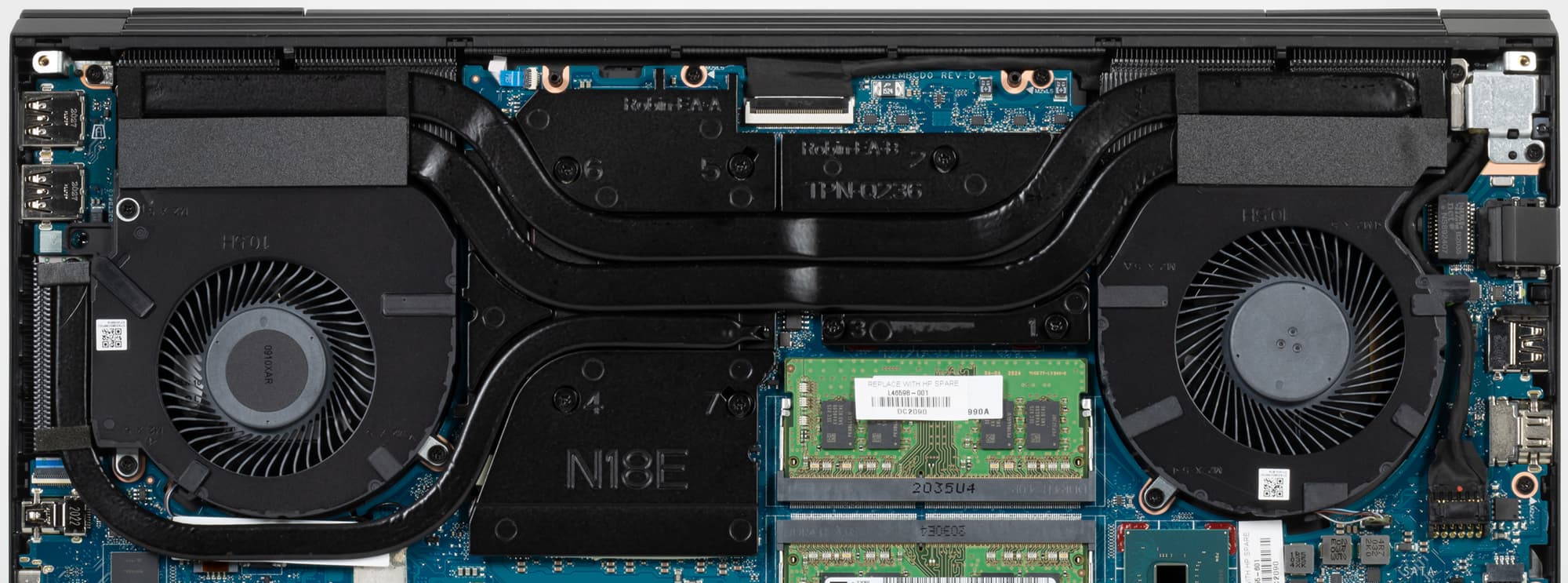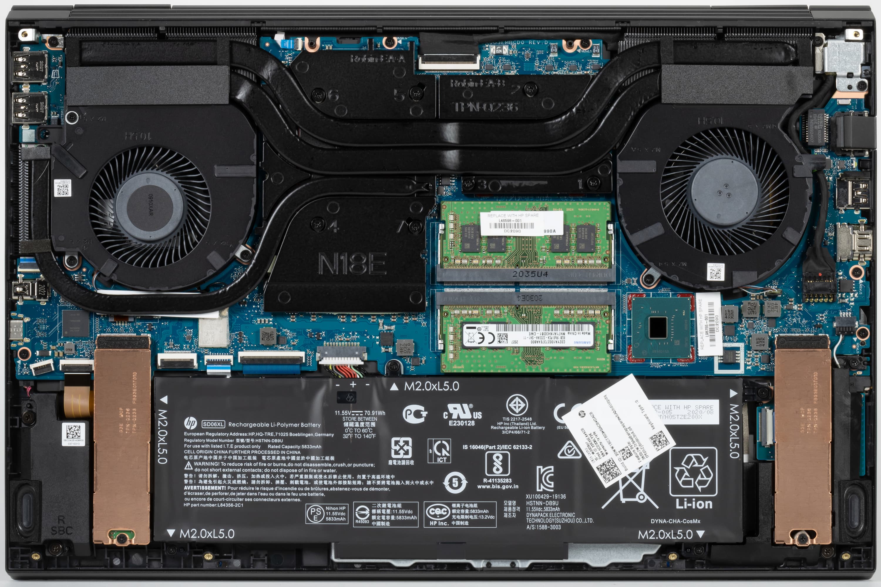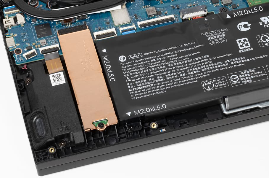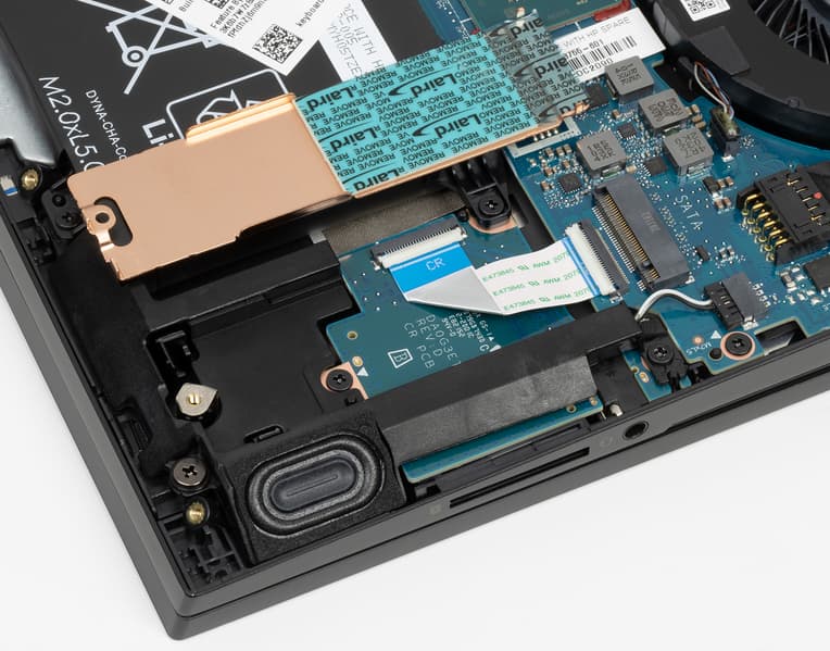 Сняв нижнюю панель корпуса, можно получить доступ к кулерам, батарее, беспроводному сетевому адаптеру, SSD-накопителю и модулям памяти. 16 ГБ памяти DDR4-2933 в ноутбуке набраны двумя модулями в слотах SO-DIMM, максимальный объем памяти при апгрейде может составить 32 ГБ. Штатный SSD установлен в слоте M.2 2280, его тоже можно заменить самостоятельно, а еще есть пустой слот M.2 2280 для установки второго накопителя.
