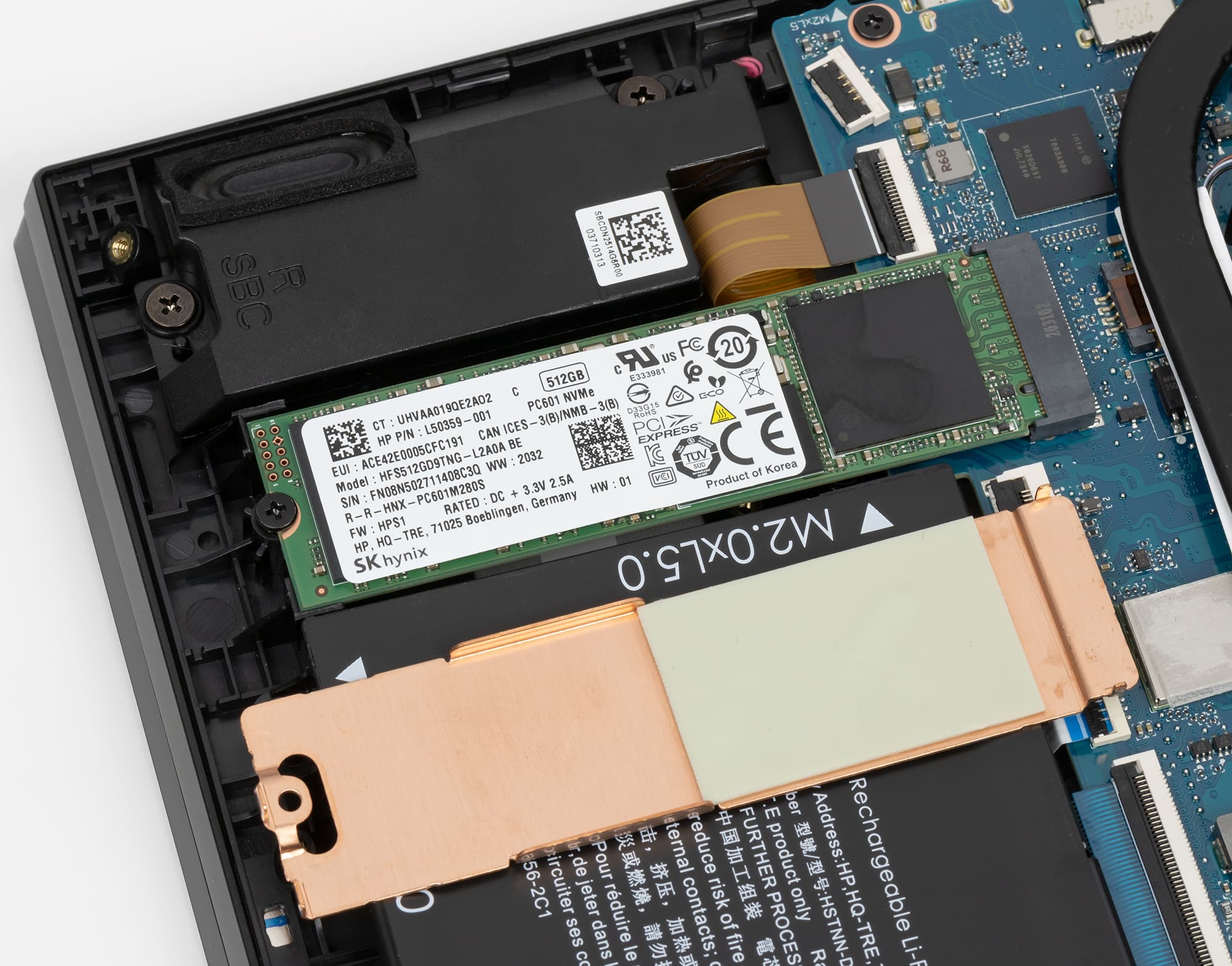 В нашей модификации ноутбука использовался SSD-накопитель SK hynix PC601 на 512 ГБ. Это NVMe-диск, установленный в слот M.2 и подключенный к внутреннему порту PCIe x4. Линейные скорости чтения и, особенно, записи у него высокие.
