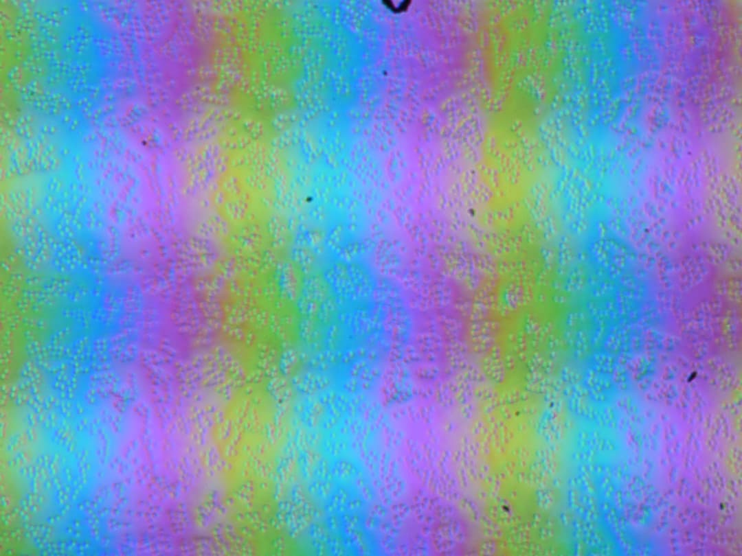 Зерно этих дефектов в несколько раз меньше размеров субпикселей (масштаб этих двух фотографий примерно одинаковый), поэтому фокусировка на микродефектах и «перескок» фокуса по субпикселям при изменении угла зрения выражены слабо, из-за этого нет и «кристаллического» эффекта.