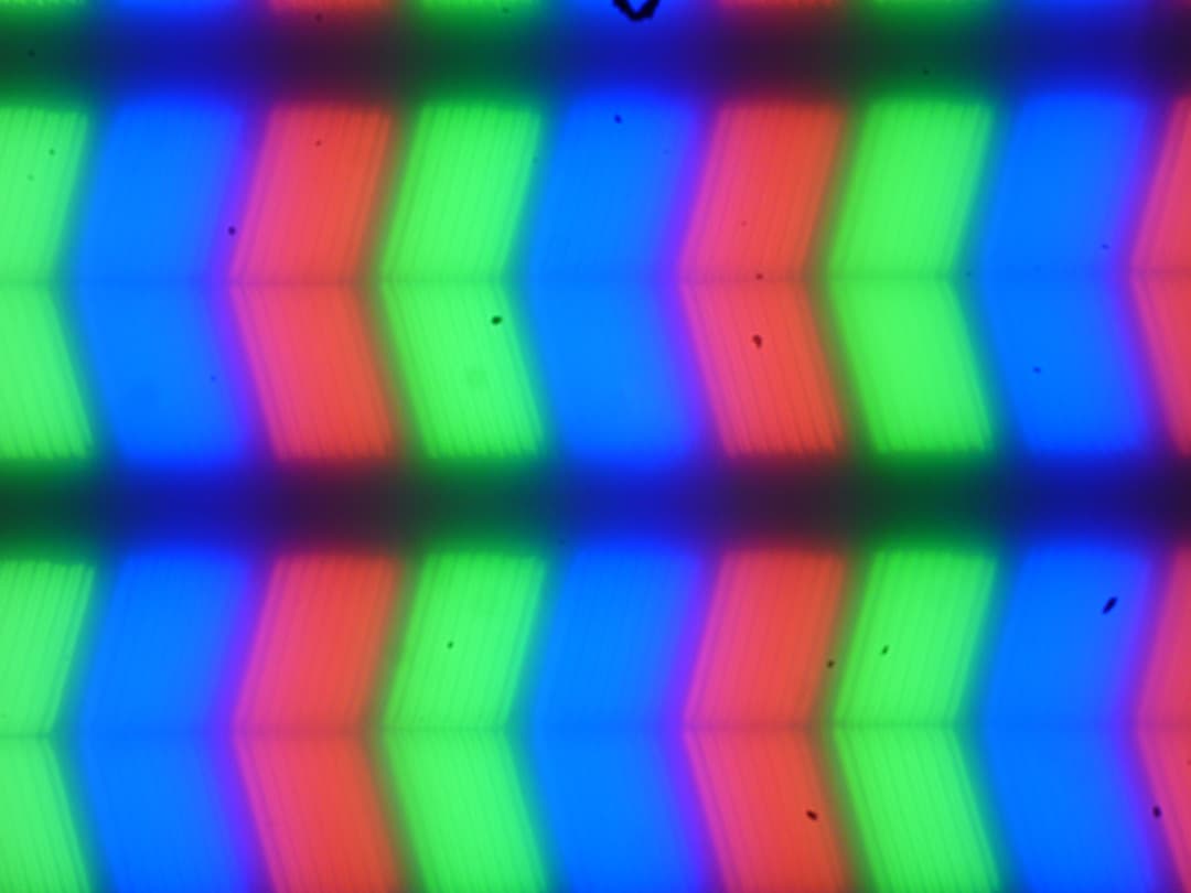 В этом ноутбуке используется матрица типа IPS. Микрофотографии демонстрируют типичную для IPS структуру субпикселей (черные точки — это пыль на матрице фотоаппарата):