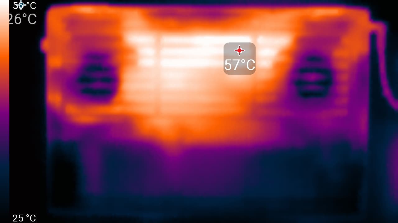 Если ноутбук не нагружать совсем, то даже в режиме Сбалансированный его система охлаждения не может продолжительное время работать в пассивном режиме — через какое-то время вентиляторы включаются и больше не выключаются. Под большой нагрузкой шум от системы охлаждения, как и производительность, зависит от выбранного профиля. Принудительное включение вентиляторов на максимальную скорость приводит к существенному повышению уровня шума и к небольшому росту производительности. Характер шума под средней нагрузкой ровный и раздражения не вызывает, но при высокой скорости вращения вентиляторов появляется низкочастотное гудение (соответствует частоте биения двух вентиляторов), что уже раздражает. В целом ноутбук, безусловно, сильно шумит под тяжелой, в том числе игровой нагрузкой. К сожалению, это характерно для всех моделей с дискретной видеокартой, так что играть на игровых ноутбуках лучше в наушниках.