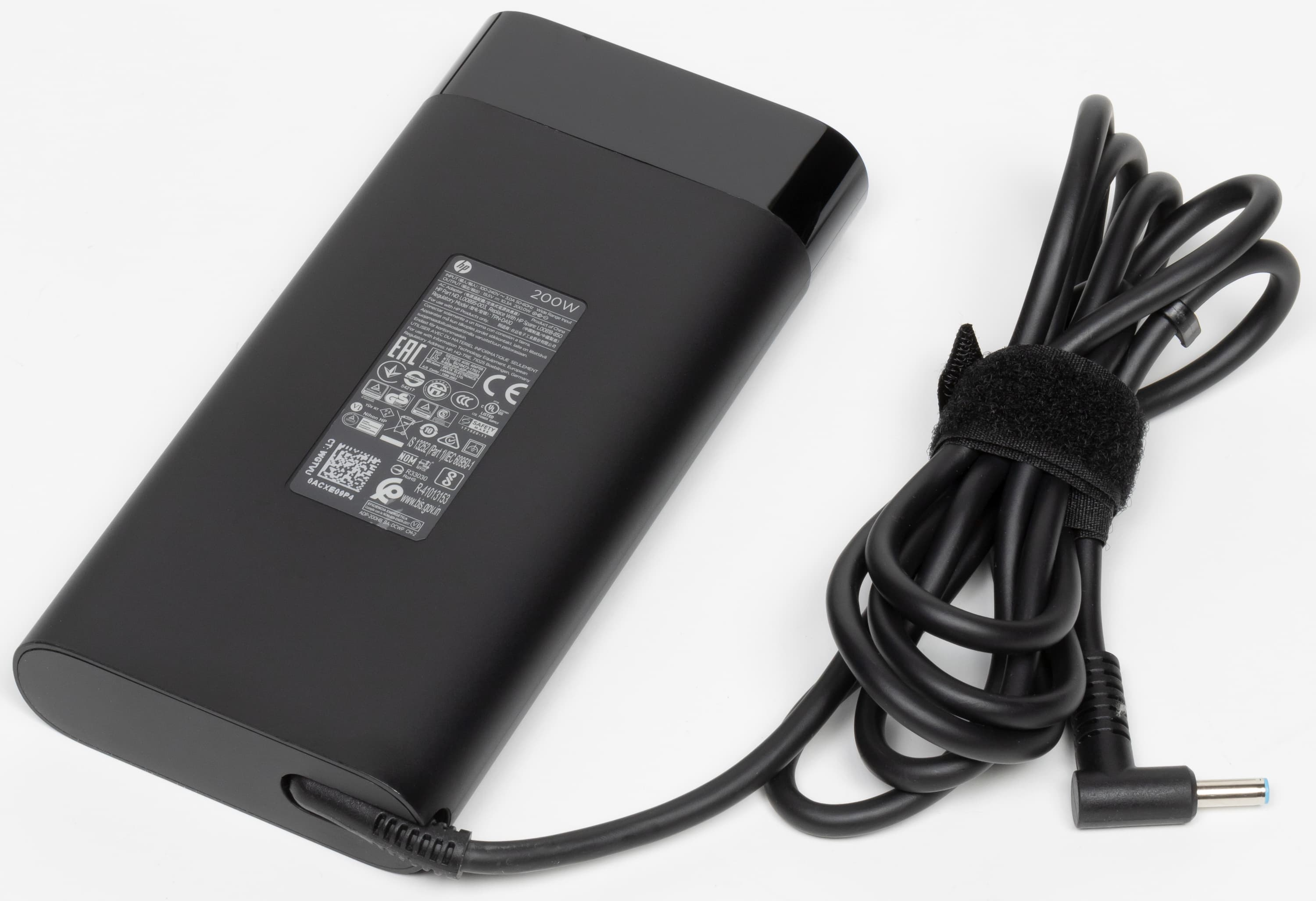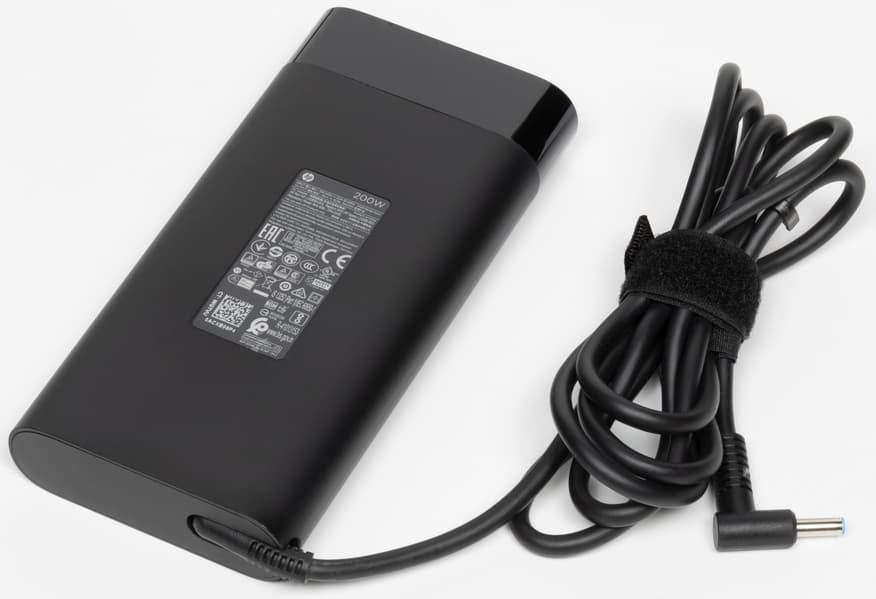 В комплекте с ноутбуком, не считая бумажной документации, можно найти только адаптер питания на 200 Вт с суммарной длиной двух кабелей 2,7 м. Адаптер весит более 0,5 кг, но не ощущается тяжелым — во многом из-за удобной формы со скруглением длинных ребер.