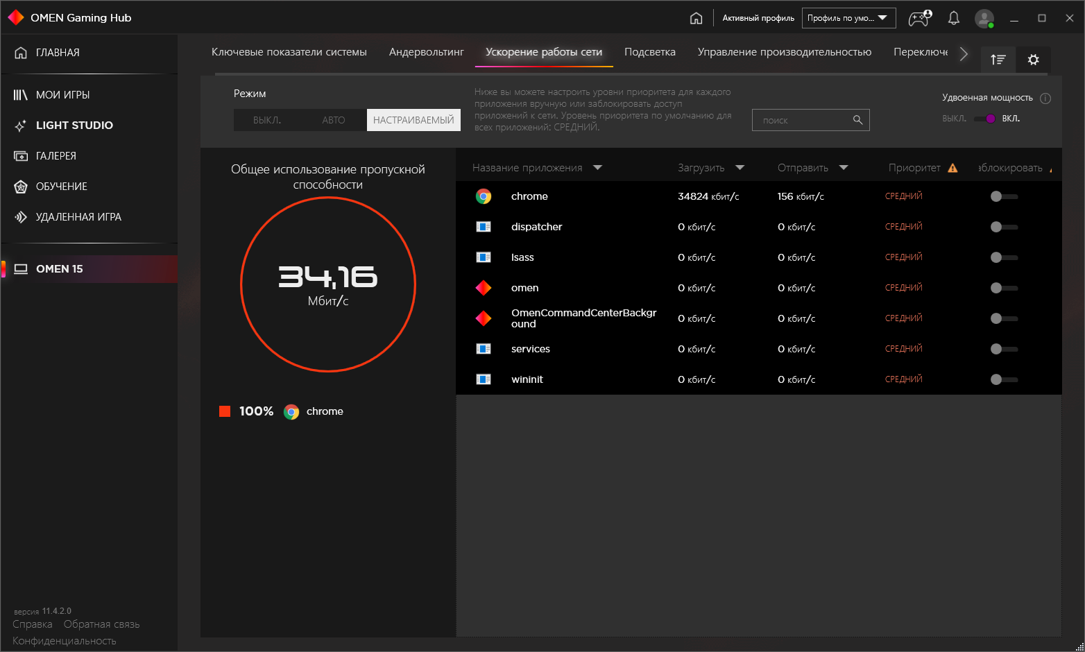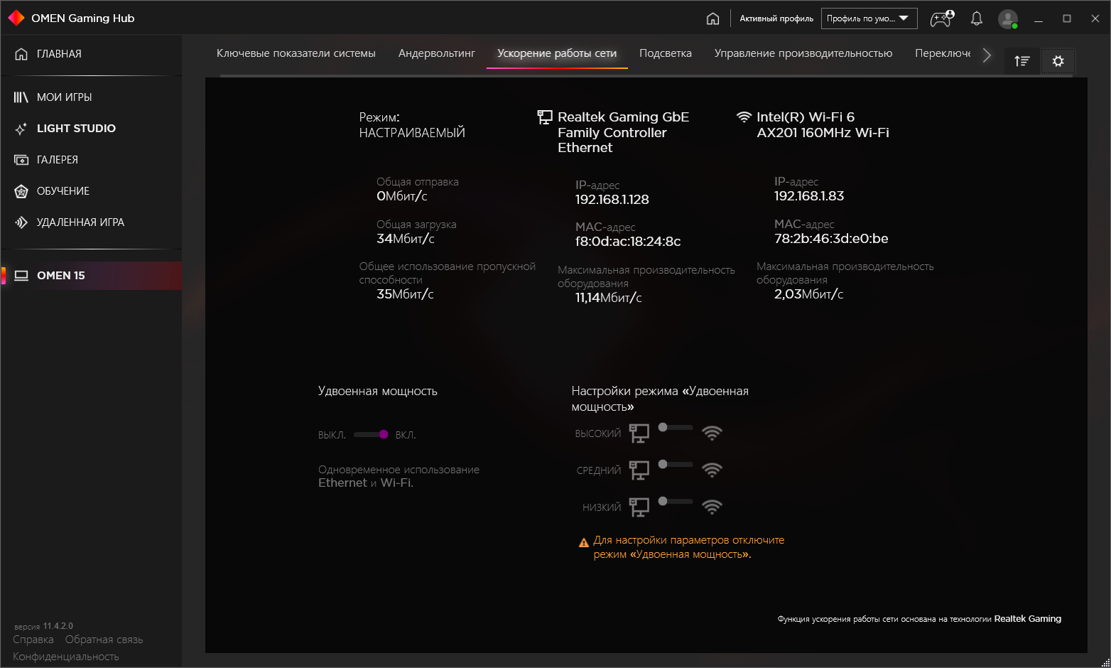 Однако последним неприметным пунктом значится название ноутбука (в нашем случае Omen 15), здесь-то и скрыты все аппаратные настройки. Простенький мониторинг вряд ли кого заинтересует (скорость вращения вентиляторов не отслеживается). «Ускорение работы сети» предлагает объединение работы проводного и беспроводного контроллера (честно говоря, кажется сомнительным, чтобы это уменьшало пинг, но тут надо тестировать на практике) либо довольно стандартную приоритизацию трафика приложений.