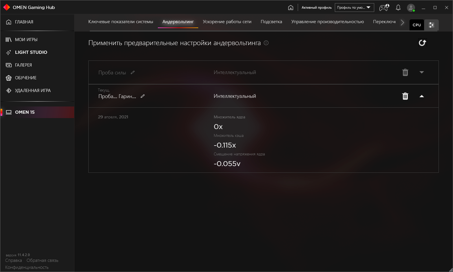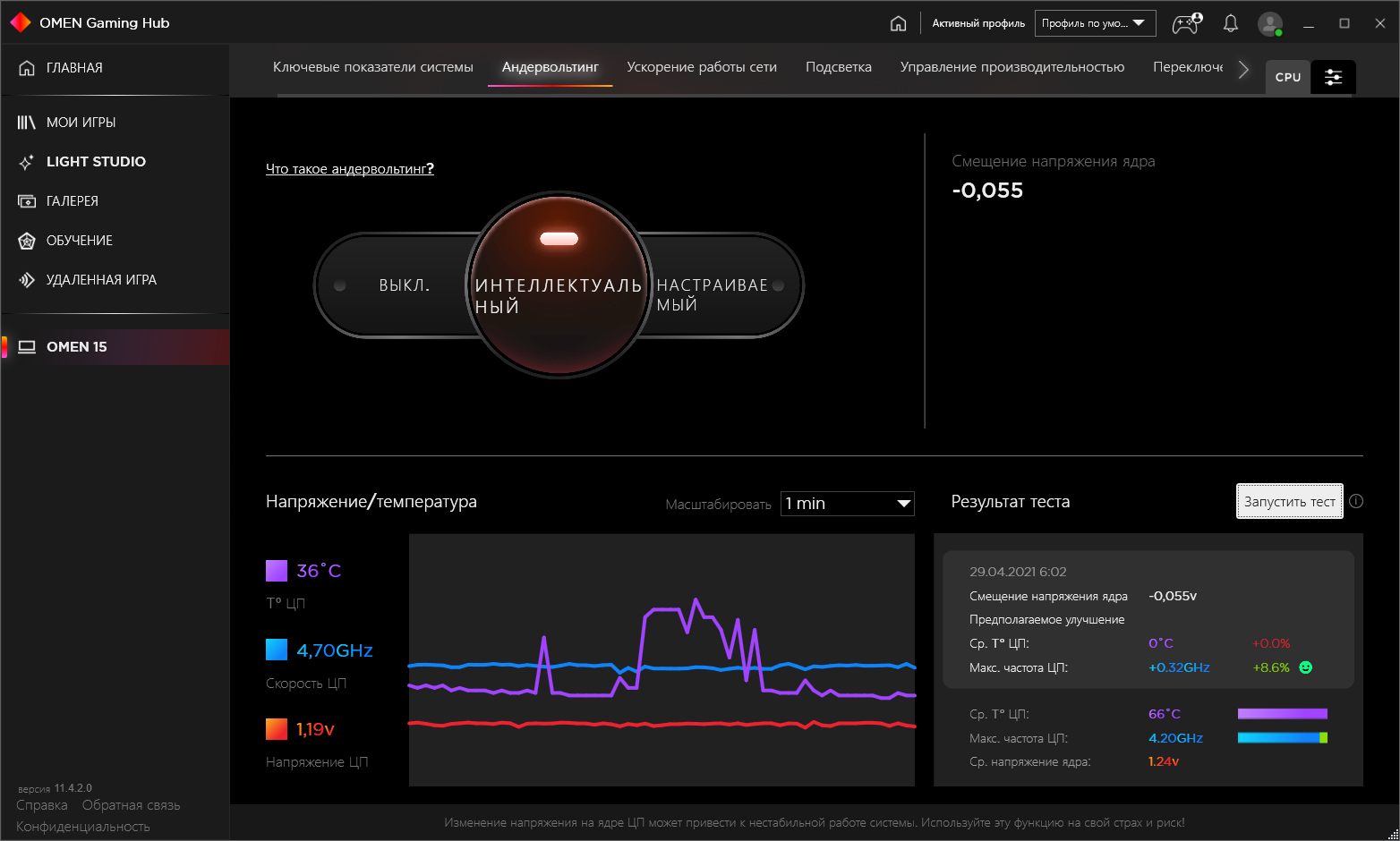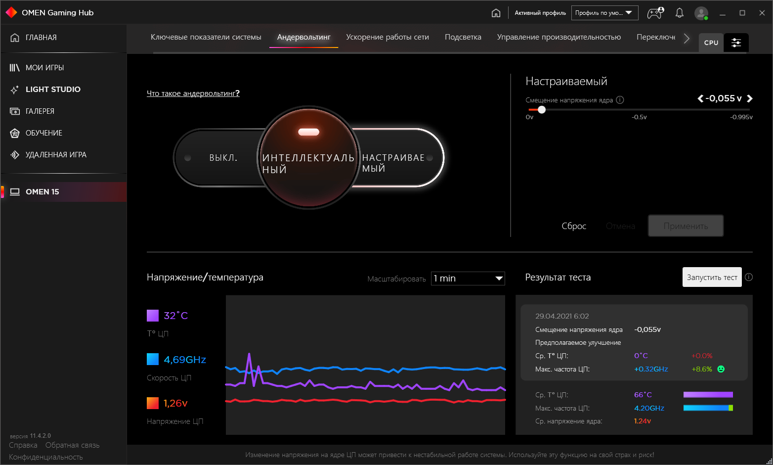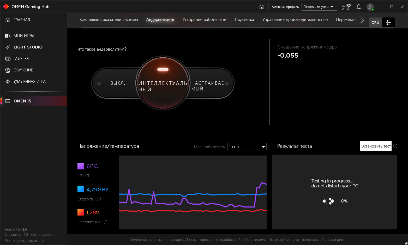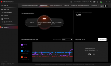 В каких-то версиях Omen Gaming Hub (или на каких-то ноутбуках Omen) есть вкладка с разгоном, в нашем же случае был доступен только андервольтинг процессора (понижение напряжения, при котором сохраняется стабильность работы). Это, впрочем, тоже довольно интересно, особенно в такой автоматической реализации. От пользователя требуется только переключиться на интеллектуальный режим, затем ноутбук несколько раз перезагрузится, каждый раз подхватывая процесс тестирования, а по окончании процесса (обещают тестирование в течение 15 минут, но на практике весь процесс занимал меньше 5 минут) будет создан новый пресет с удачным результатом. Затем можно просматривать и применять сохраненные пресеты, а выбрав один из них, запустить тестирование, которое покажет предполагаемый выигрыш в «реальных» единицах — повышении частоты и понижении температуры. Самые настойчивые могут взять управление в свои руки и задать собственные параметры андервольтинга в ручном режиме, после цикла перезагрузок с практической проверкой заданного режима можно будет сохранить новый пресет и использовать его.