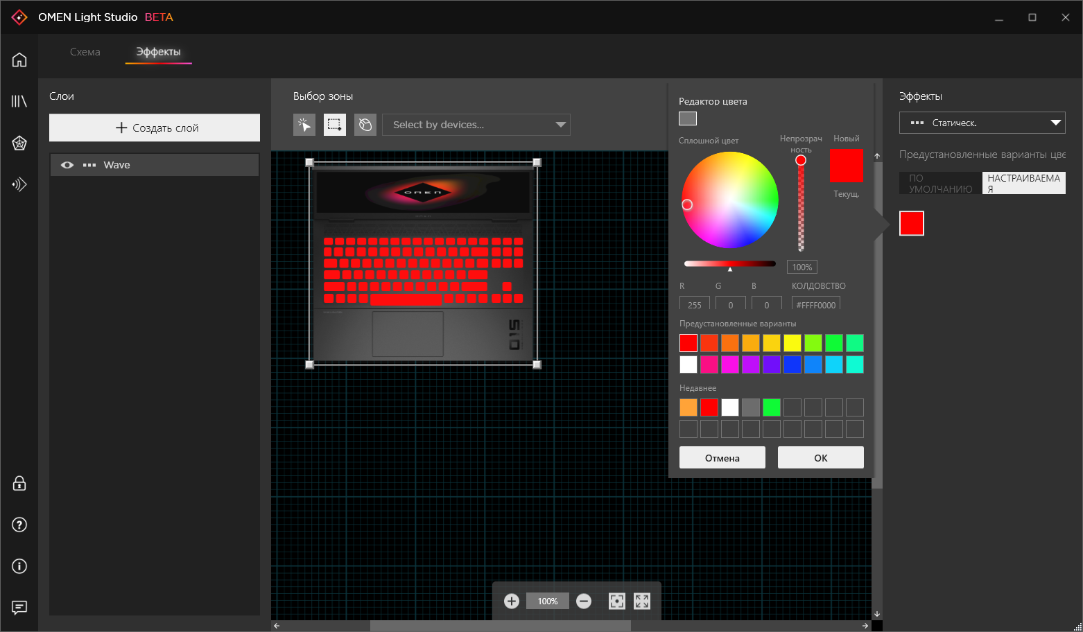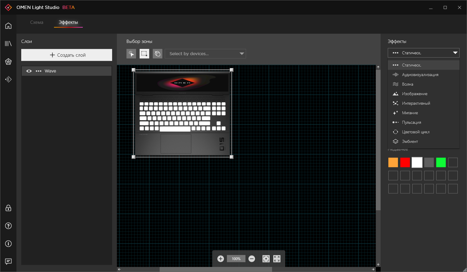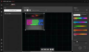 Наконец, прямо из Omen Gaming Hub можно задать статичную подсветку четырех зон клавиатуры, а если это покажется скучновато, можно оттуда же запустить Omen Light Studio. В этой утилите доступны динамические эффекты, в том числе цветомузыка, и для каждого достаточно настроек. Omen Light Studio на момент нашего знакомства находилась в стадии бета-тестирования (как это сейчас принято, тестирование проводится прямо на пользователях). К сожалению, мы столкнулись с неприятной особенностью текущей версии: она некорректно работает в фоне, «отжирая» довольно большой процент времени процессора, причем даже когда подсветка вообще выключена. В обычной жизни вы вряд ли сумеете это заметить, а вот на тестировании автономного режима, особенно с минимальной нагрузкой, фоновая работа Omen Light Studio сильно сказывается. Приходится утихомирить ее штатными средствами Windows.