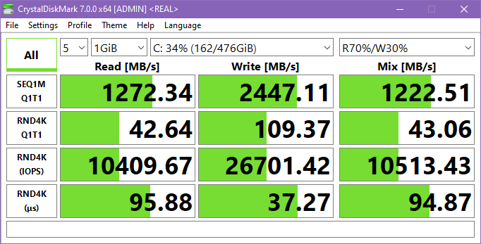Производительность SSD в реальных задачах также не максимальная, но она очень высокая, узким местом такой накопитель точно не станет.