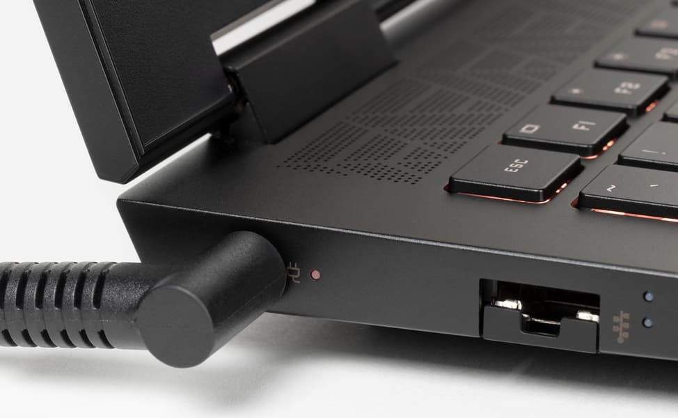 Размеры у HP Omen 15-ek0039ur в целом типичные для игровых 15-дюймовых моделей, а в глубину он даже, скорее, компактный. Вес, опять же для своего класса, небольшой (2,1 кг), потому что корпус в целом пластмассовый, хотя HP упоминает некое металлическое покрытие крышки и рабочей поверхности. Субъективно металл не ощущается, хотя гладкое матовое покрытие всех поверхностей приятно на ощупь. Про цвет производитель говорит, что он темно-серый, но в реальности он чисто черный. А вот пластик нетрудно определить по реакции корпуса на нажатия. Основание и клавиатура, в общем, проминаются незначительно, однако крышка в средней части прогибается легко и очень глубоко при малейшем надавливании, благо под ней лишь пустота до клавиатуры, а на основание она опирается только у ближнего края корпуса. Работать с ноутбуком за столом это не мешает, никаких скрипов в руках корпус не издает, расходящихся щелей нет. Однако при перевозке в мягких сумках и рюкзаках крышка может прожиматься до клавиатуры, надо иметь эту особенность в виду.