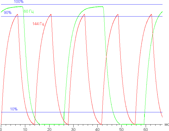 Посмотрим, хватит ли такой скорости матрицы для вывода изображения с частотой 144 Гц. Приведем зависимость яркости от времени при чередовании белого и черного кадра при кадровой частоте 144 Гц (и при 60 Гц для сравнения):