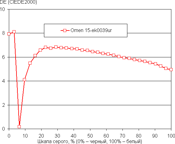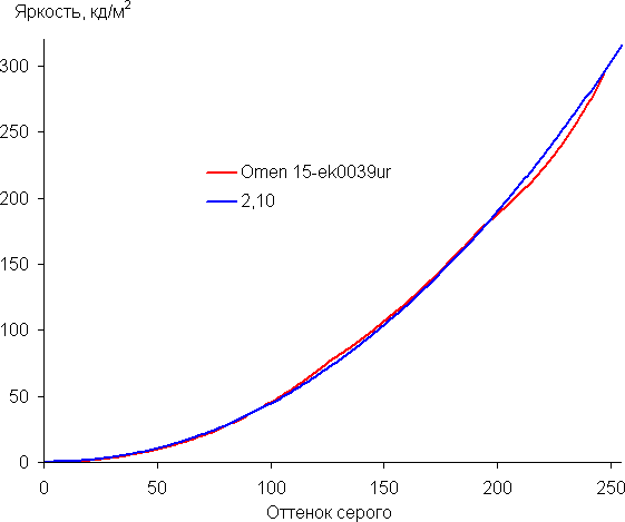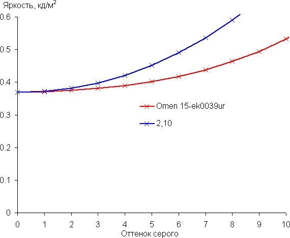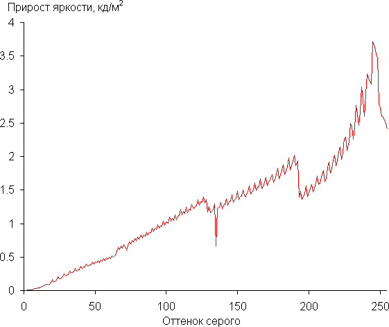 Далее мы измерили яркость 256 оттенков серого (от 0, 0, 0 до 255, 255, 255). График ниже показывает прирост (не абсолютное значение!) яркости между соседними полутонами: