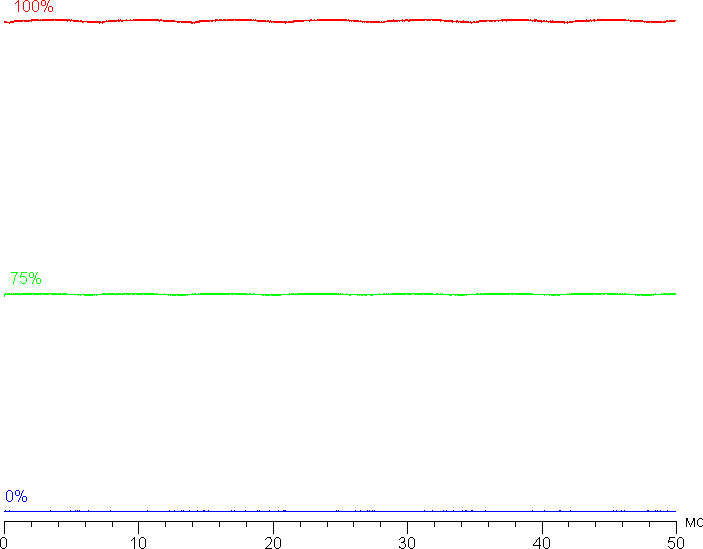 На любом уровне яркости значимая модуляция подсветки отсутствует, поэтому нет и никакого мерцания экрана. В доказательство приведем графики зависимости яркости (вертикальная ось) от времени (горизонтальная ось) при различных значениях настройки яркости: