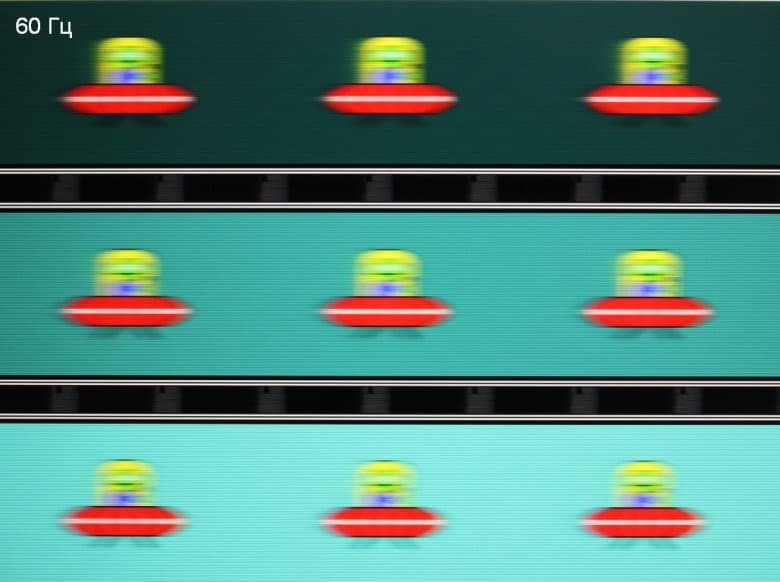 Для наглядного представления о том, что на практике означает такая скорость матрицы и какие артефакты может вызвать разгон матрицы, приведем снимки, полученные с помощью движущейся камеры. Такие снимки показывают, что́ видит человек, если он следит глазами за двигающимся на экране объектом. Описание теста приведено тут, страница с самим тестом тут. Использовались рекомендованные установки (скорость движения 960 пиксель/с), выдержка 1/15 с. Снимки сделаны для кадровой частоты 60 и 144 Гц.