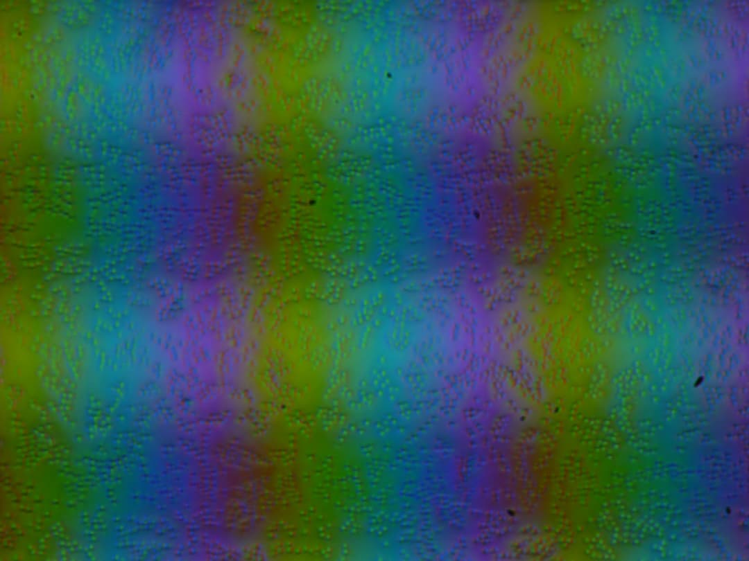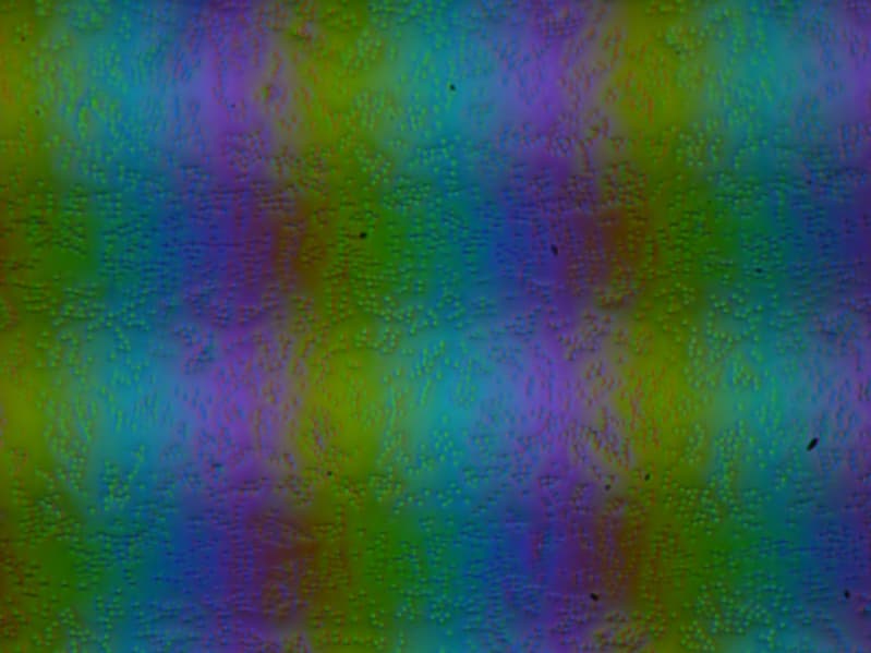 Зерно этих дефектов в несколько раз меньше размеров субпикселей (масштаб этих двух фотографий примерно одинаковый), поэтому фокусировка на микродефектах и «перескок» фокуса по субпикселям при изменении угла зрения выражены слабо, из-за этого нет и «кристаллического» эффекта.