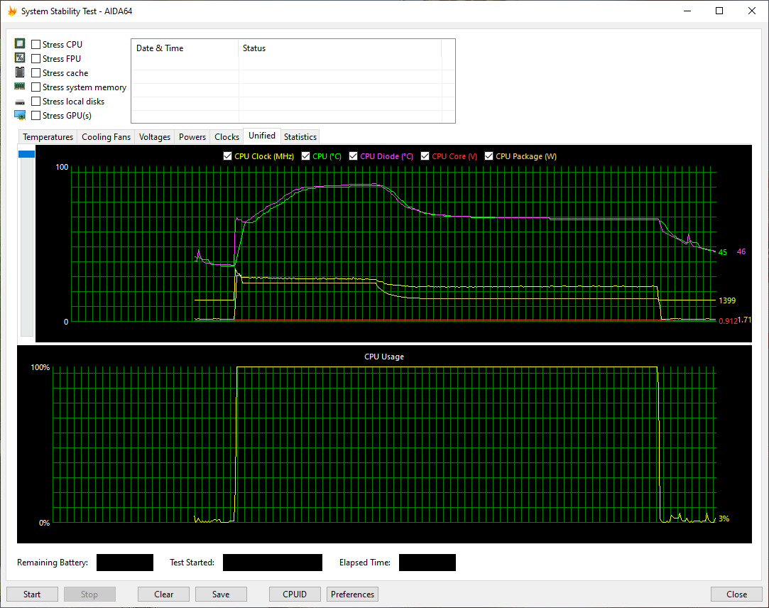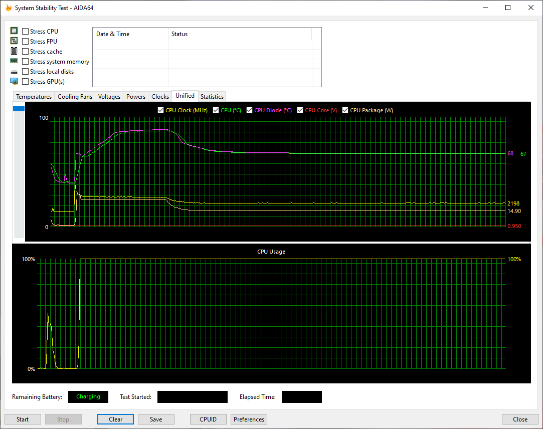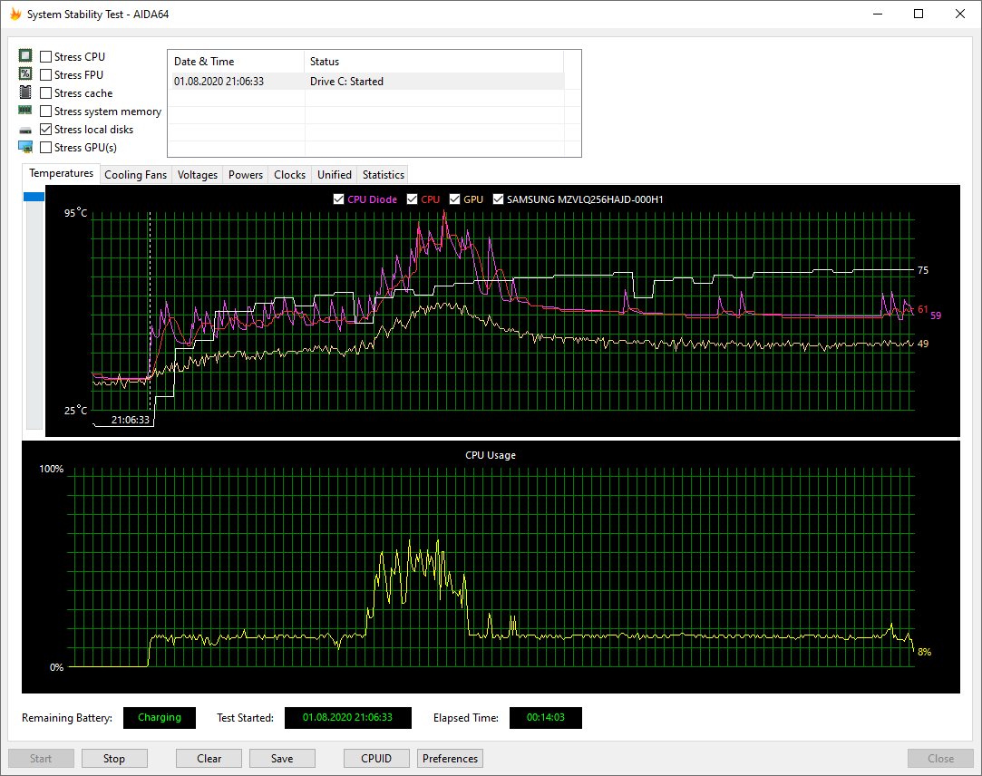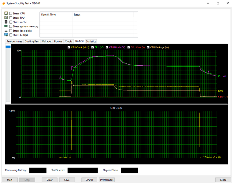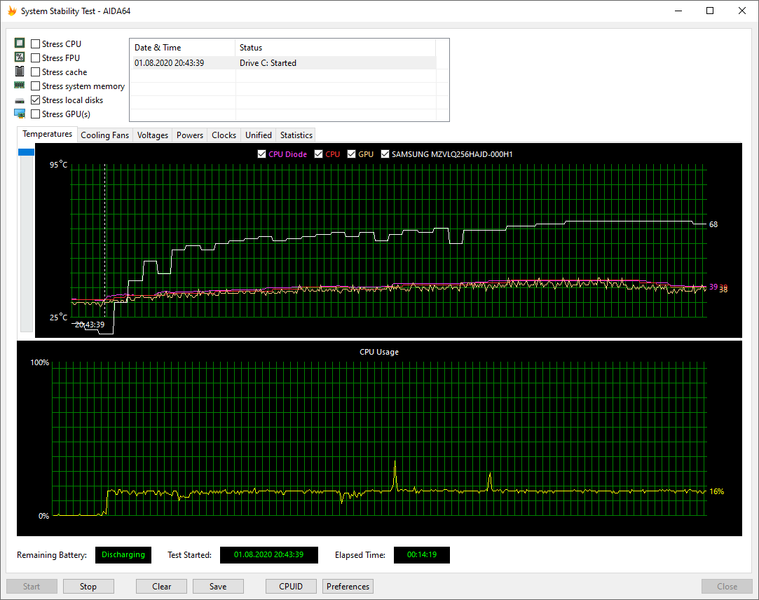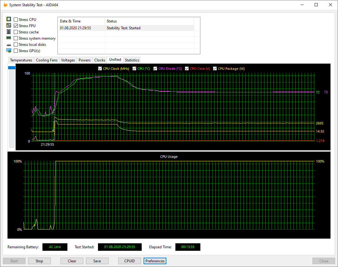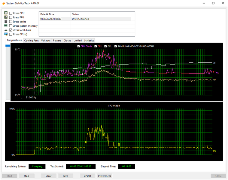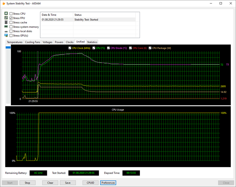 Температурный режим работы HP ProBook 455 G7 мы проверили при подключении к электросети и при работе от аккумулятора, используя для нагрузки стресс-алгоритм FPU утилиты AIDA64 Extreme. Все тесты проводились под управлением операционной системы Windows 10 с установкой последних доступных драйверов и обновлений. Температура в помещении во время тестирования составляла около 25 °C. Посмотрим на результаты.