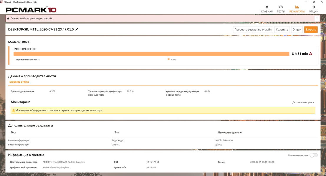 Первые тесты автономности HP ProBook 455 G7 мы проводили с помощью тестового пакета PCMark’10 в режимах Modern Office и Gaming. Яркость дисплея фиксировалась на 46%, что эквивалентно 100 кд/м². Сетевые соединения не отключались. В результате при эмуляции повседневной работы (Modern Office) ноутбук продержался почти 9 часов, чего будет вполне достаточно, если, конечно, вы не фанат-трудоголик, спящий по 4 часа в день.