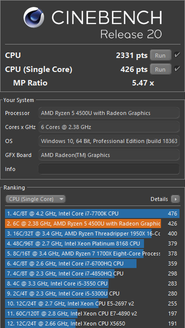 Теперь в нескольких бенчмарках протестируем производительность HP ProBook 455 G7 в двух режимах: от адаптера питания и от аккумулятора.