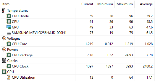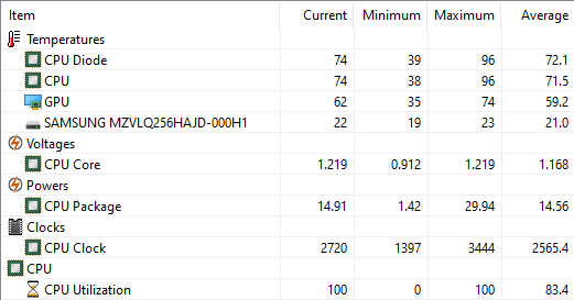 Вы можете удивиться, но в двух этих режимах ноутбук HP ProBook 455 G7 ведет себя практически одинаково. Разница лишь в том, что при работе от адаптера питания частота процессора кратковременно повышалась до 4 ГГц, тогда как при работе от аккумулятора она не превышала отметку 3,45 ГГц. Но финальная частота CPU у этих двух режимов одинакова: 2,7 ГГц при потреблении 15 Вт. Одинаковой получается и температура процессора, в пике достигающая 96 °C, а затем стабилизирующаяся на 72-74 градусах.