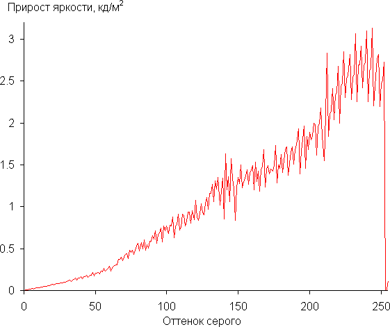 Далее мы измерили яркость 256 оттенков серого (от 0, 0, 0 до 255, 255, 255). График ниже показывает прирост (не абсолютное значение!) яркости между соседними полутонами: