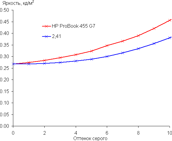 Аппроксимация полученной гамма-кривой дала показатель 2,41, что выше стандартного значения 2,2, при этом реальная гамма-кривая на большей части шкалы серого мало отклоняется от аппроксимирующей степенной функции: