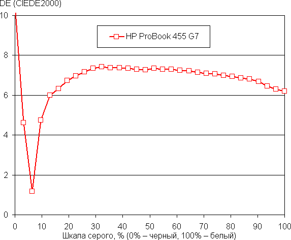 Рост прироста яркости на большей части шкалы серого более-менее равномерный, и почти каждый следующий оттенок ярче предыдущего. Но в светах это правило нарушается, и три ближайших к белому оттенка по яркости от него не отличаются. Впрочем, такой завал в светах нельзя считать существенным. В самой темной области визуально различаются все оттенки: