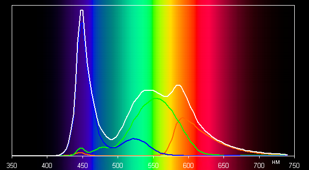 Ниже приведен спектр для белого поля (белая линия), наложенный на спектры красного, зеленого и синего полей (линии соответствующих цветов):