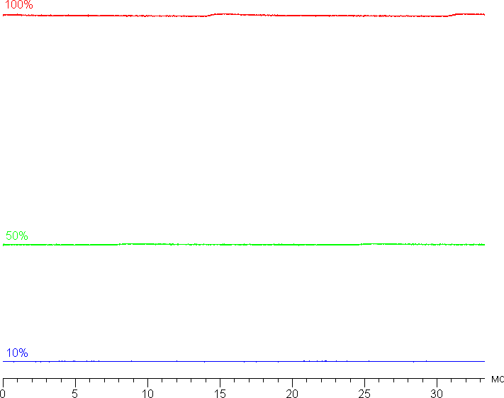 На любом уровне яркости значимая модуляция подсветки отсутствует, поэтому нет и никакого мерцания экрана. В доказательство приведем графики зависимости яркости (вертикальная ось) от времени (горизонтальная ось) при различных значениях настройки яркости: