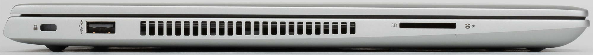 Все разъемы и порты расположены на боковых сторонах корпуса. На левый торец выведены кенсингтонский замок, порт USB 2.0, вентиляционная решетка, через которую выбрасывается нагретый воздух, и слот под карты памяти SD.