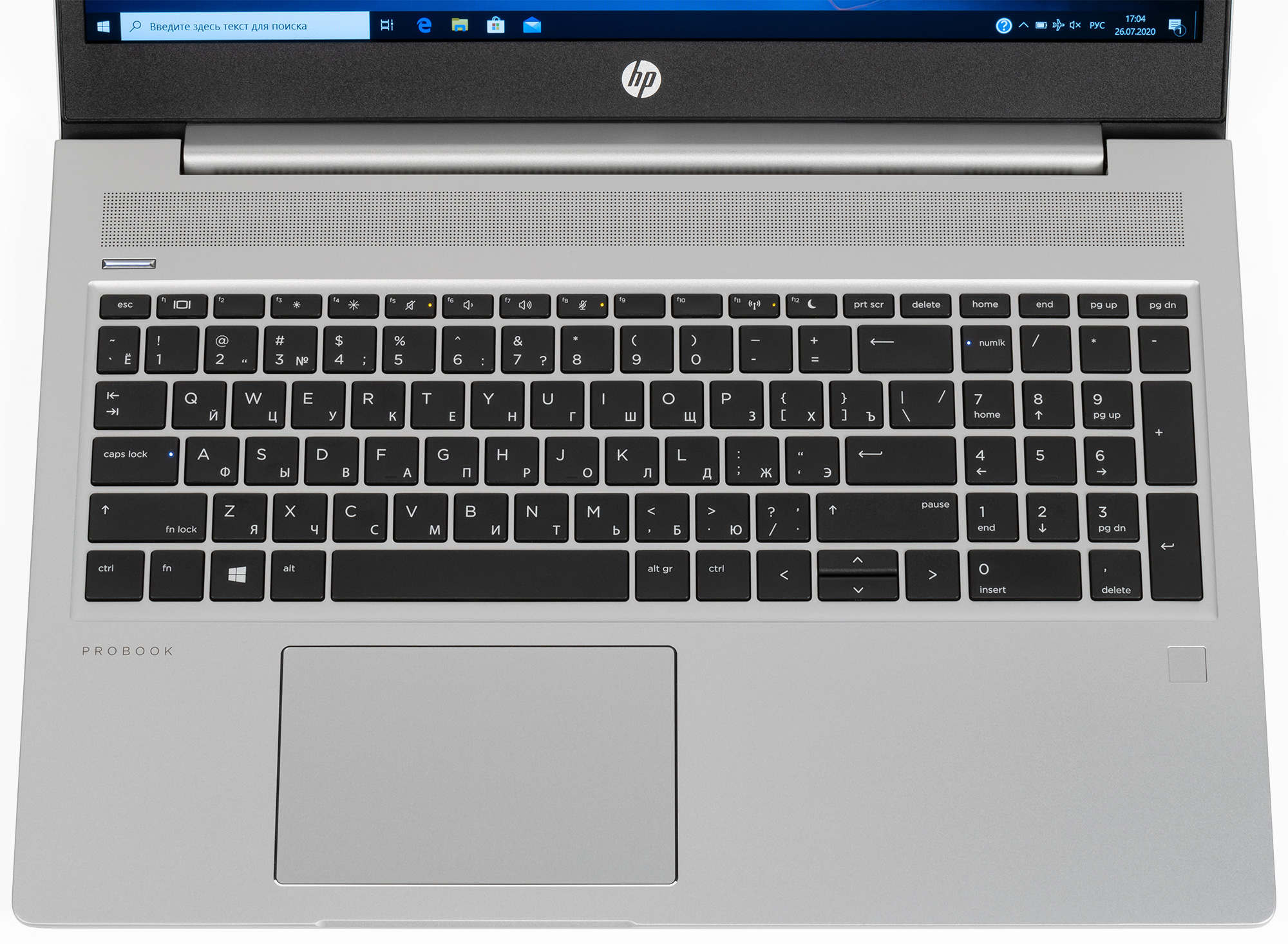 В HP ProBook 455 G7 реализована клавиатура мембранного типа с блоком цифровых клавиш и регулируемой подсветкой. Размеры клавиш с буквами составляют 15×15 мм, а клавиши функционального ряда вдвое у́же.