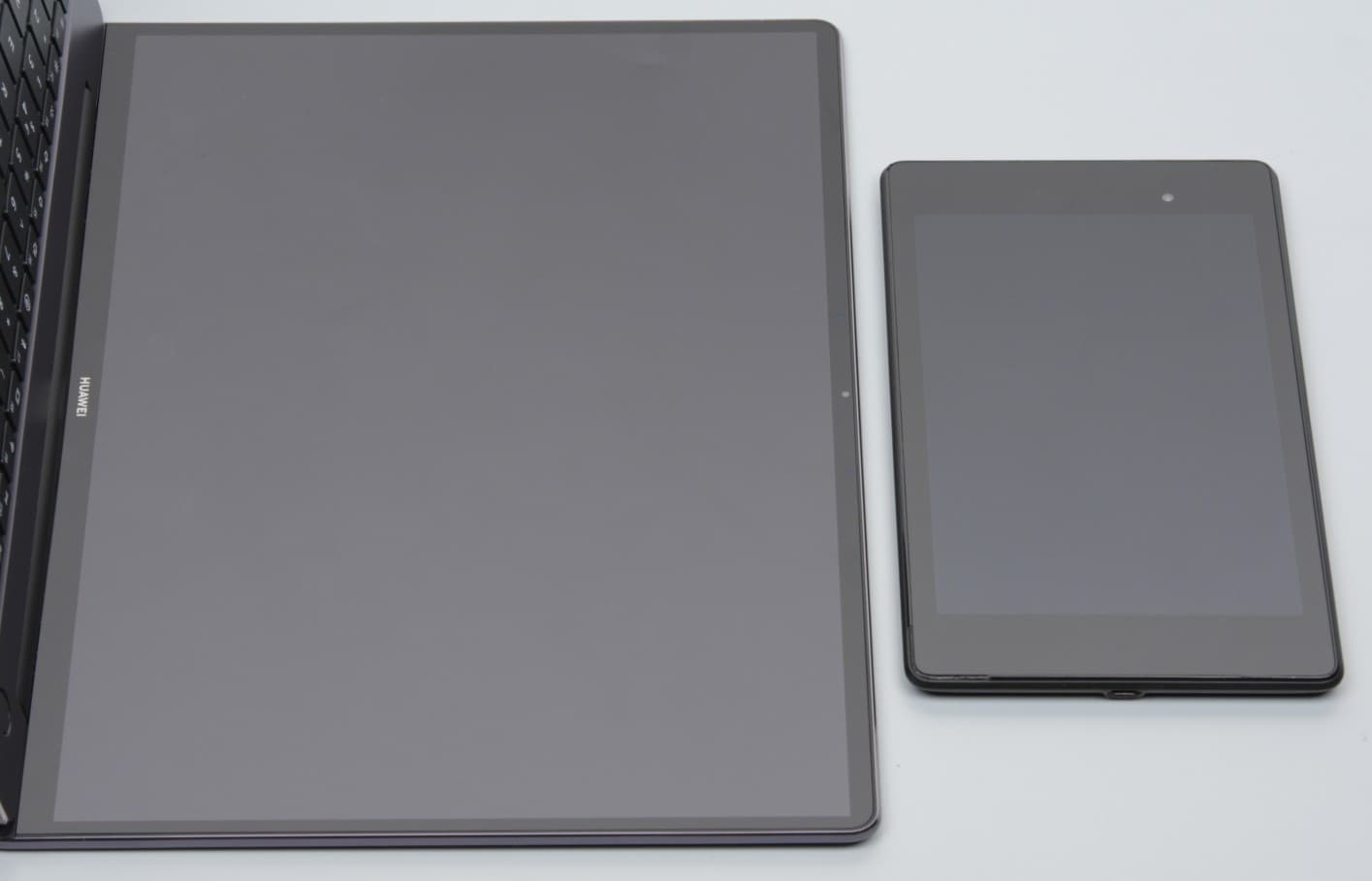Лицевая поверхность экрана изготовлена из стеклянной пластины, устойчивой к появлению царапин. Экран снаружи зеркально-гладкий. На внешней поверхности экрана есть специальное олеофобное (жироотталкивающее) покрытие, которое по эффективности заметно лучше, чем у экрана планшета Google Nexus 7 (2013) (далее просто Nexus 7), поэтому следы от пальцев удаляются существенно легче, а появляются с меньшей скоростью, чем в случае обычного стекла. Экран сенсорный, датчик распознает до 10 прикосновений одновременно. Судя по яркости отраженных объектов, антибликовые свойства экрана не хуже, чем у Nexus 7. Для наглядности приведем фотографию, на которой в экранах обоих устройств отражается белая поверхность (где что — разобраться несложно):