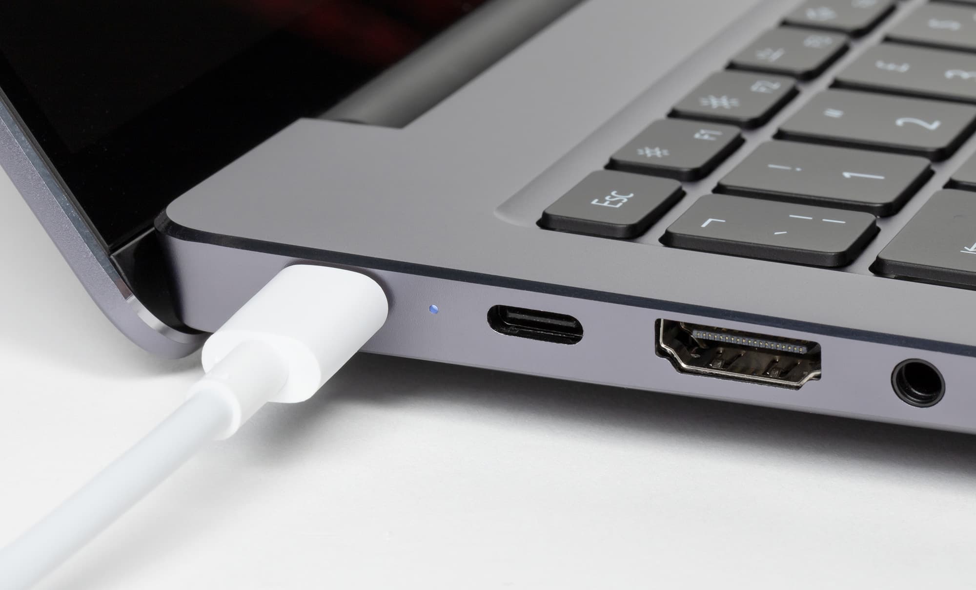 Он соединяется кабелем с любым портом USB-C ультрабука, при зарядке мигает белый светодиод.