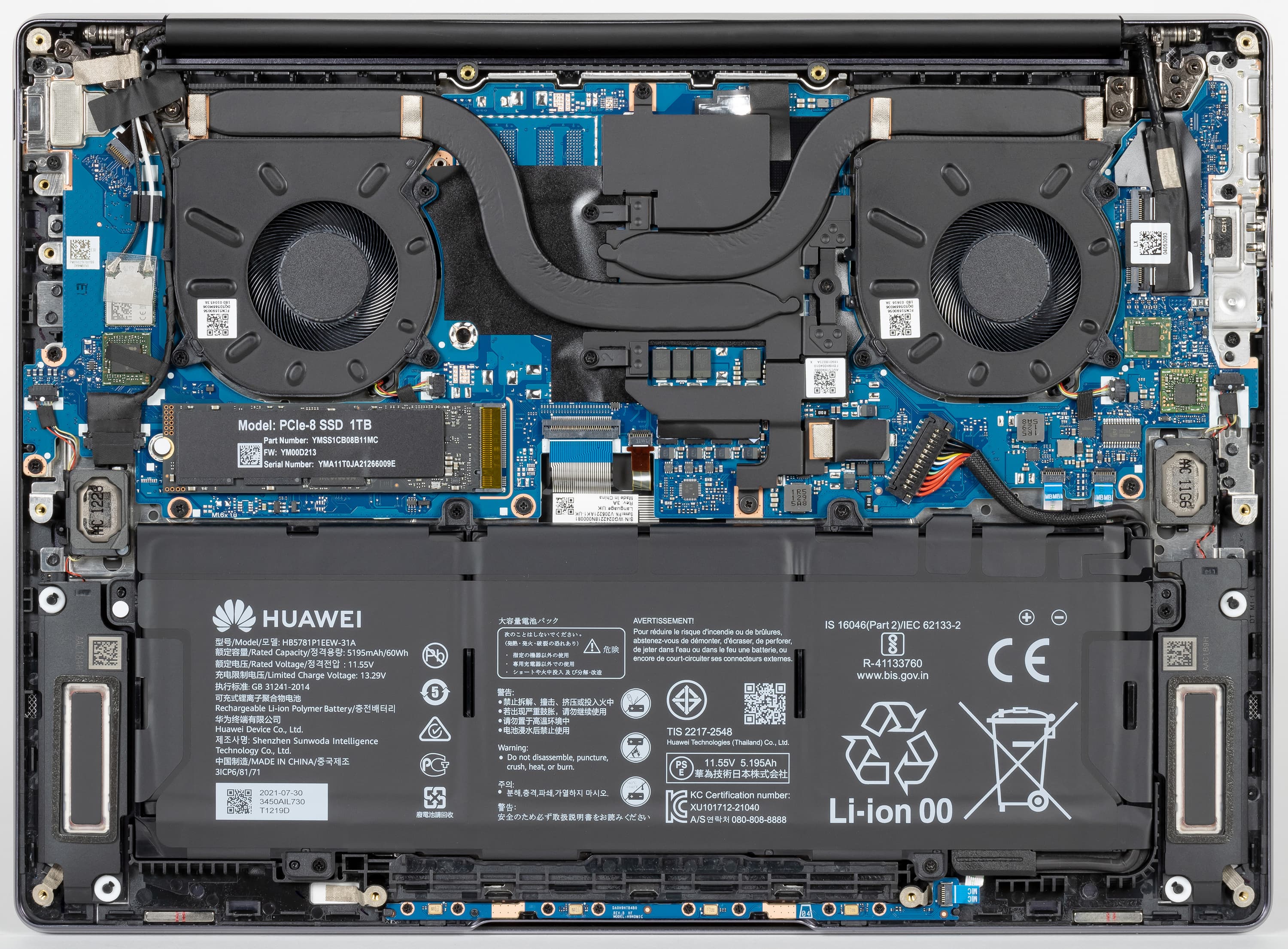 В сравнении с MateBook 14 2021 система охлаждения претерпела изменения, что не удивительно, так как тепловой пакет нового процессора на 25% выше, чем у прежнего. В ней увеличены радиаторы, диаметр вентиляторов и (с 6 до 8 мм) размер второй тепловой трубки.
