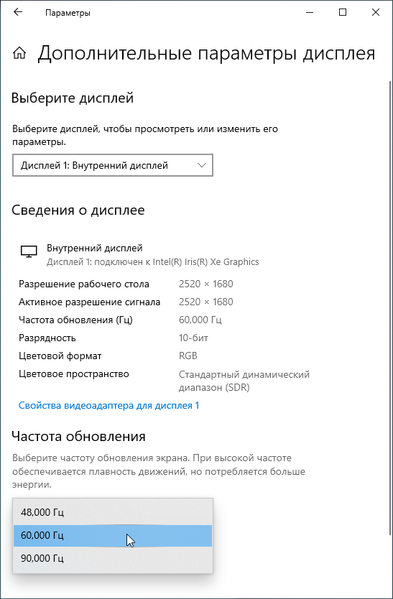 В настройках экрана на выбор доступны три частоты обновления — 48, 60 и 90 Гц. По крайней мере при родном разрешении экрана вывод идет с глубиной цвета 10 бит на цвет.