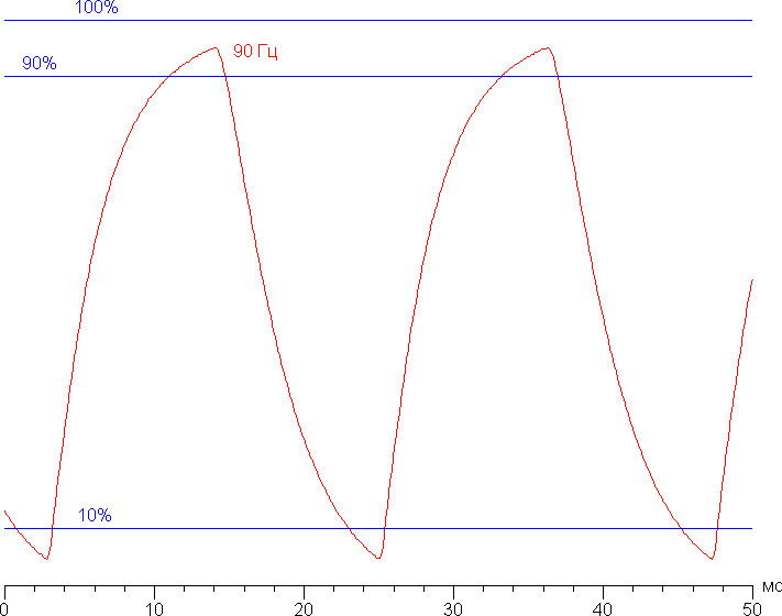 Посмотрим, хватит ли такой скорости матрицы для вывода изображения с частотой 90 Гц. Приведем зависимость яркости от времени при чередовании белого и черного кадра при 90 Гц кадровой частоты: