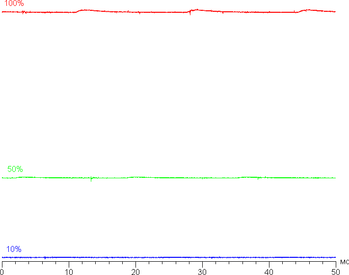 На любом уровне яркости значимая модуляция подсветки отсутствует, поэтому нет и никакого мерцания экрана. В доказательство приведем графики зависимости яркости (вертикальная ось) от времени (горизонтальная ось) при различных значениях настройки яркости: