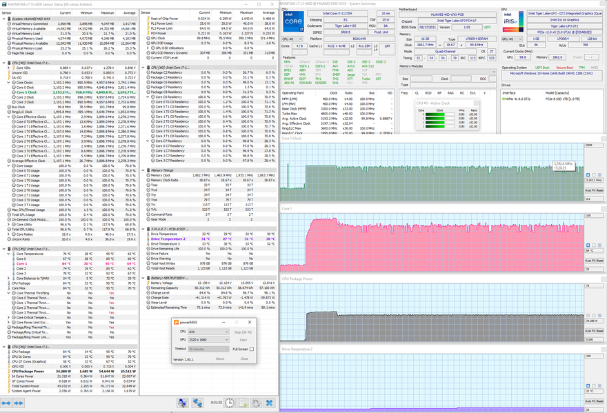 Мы протестировали Huawei MateBook 14s и его систему охлаждения в стресс-тесте powerMax (с использованием AVX-инструкций) при питании от комплектного адаптера в двух режимах, получив следующие результаты.