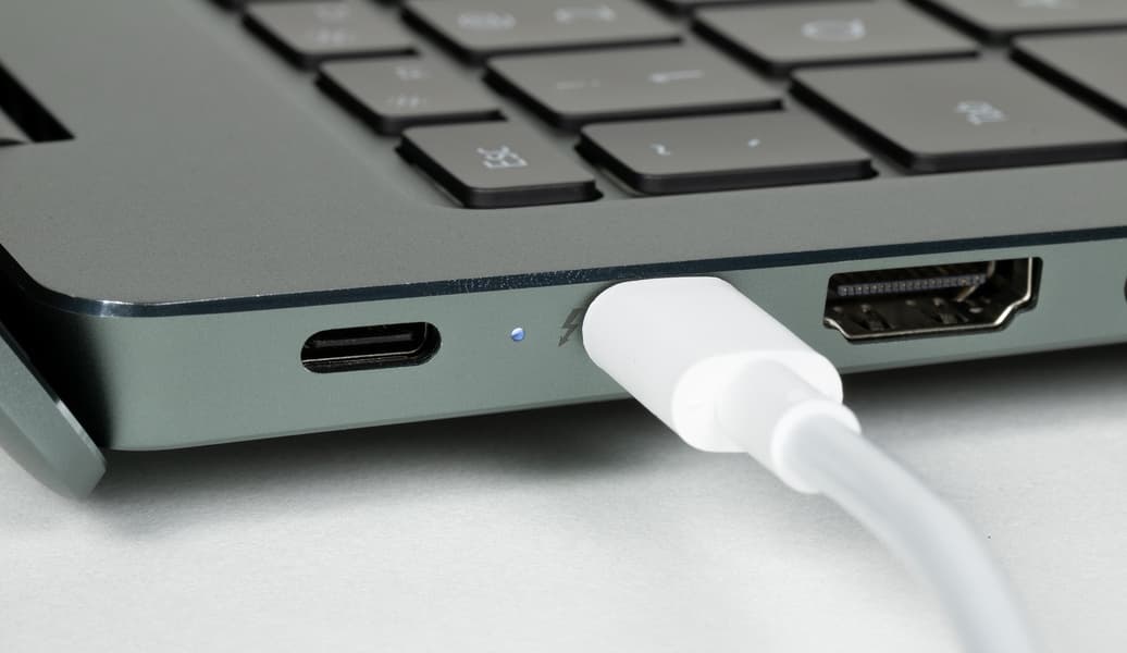 Зарядка ультрабука возможна через любой из двух портов USB-C, а в процессе зарядки мигает белый светодиод.