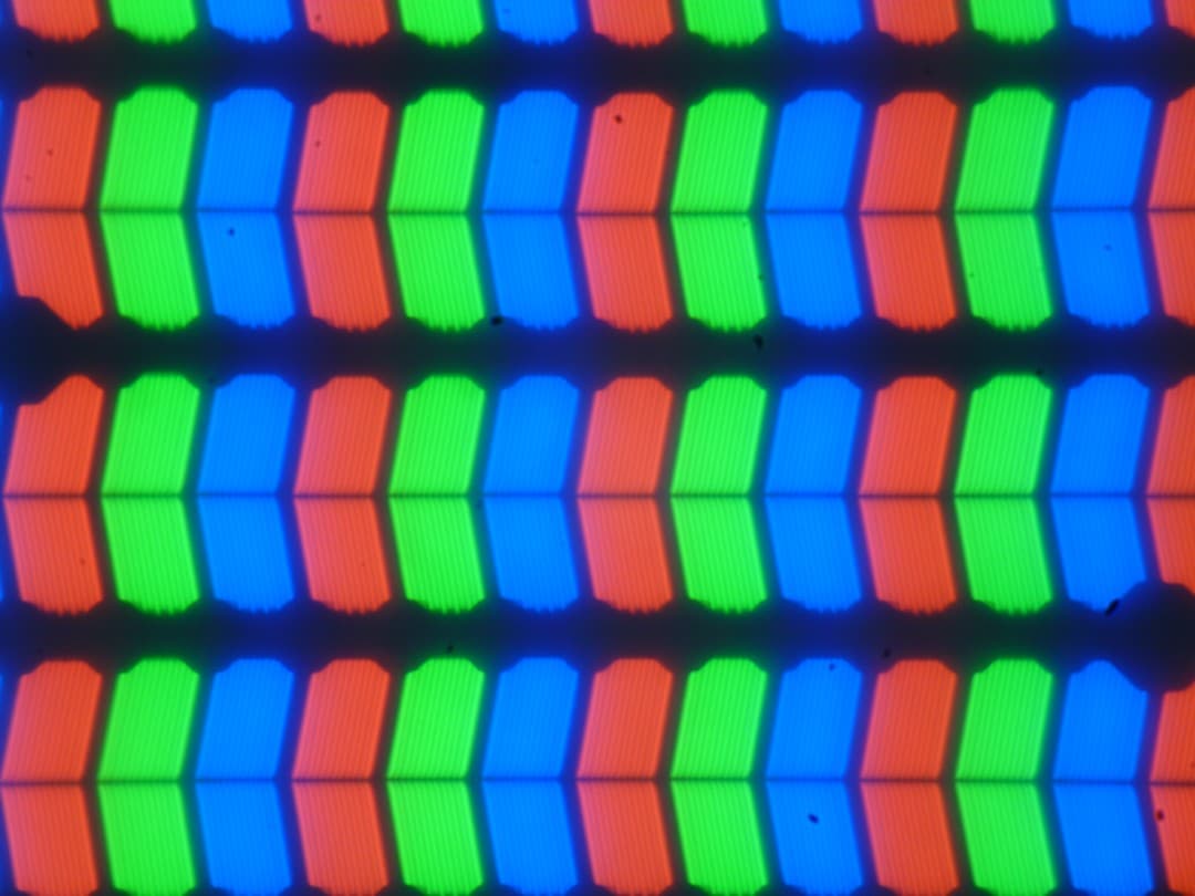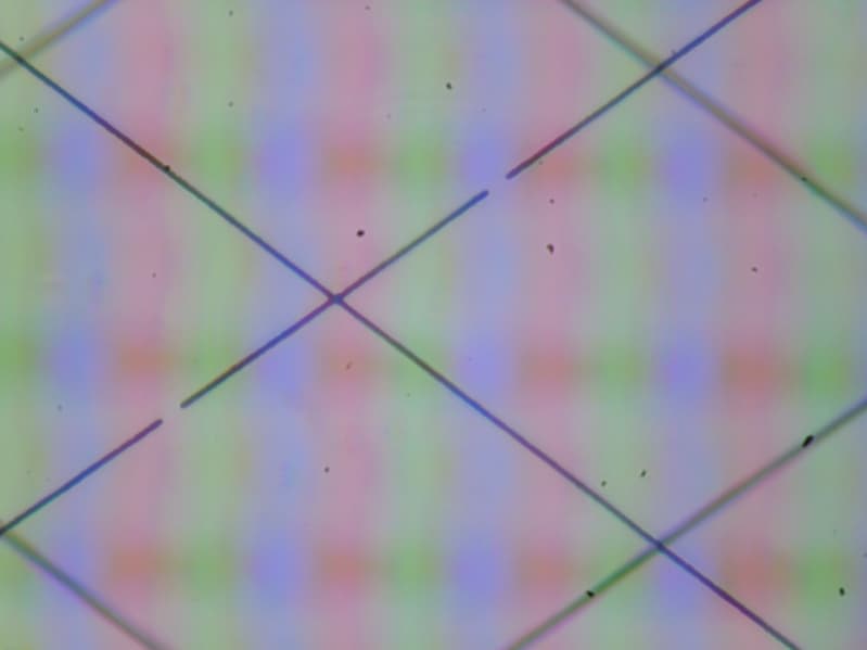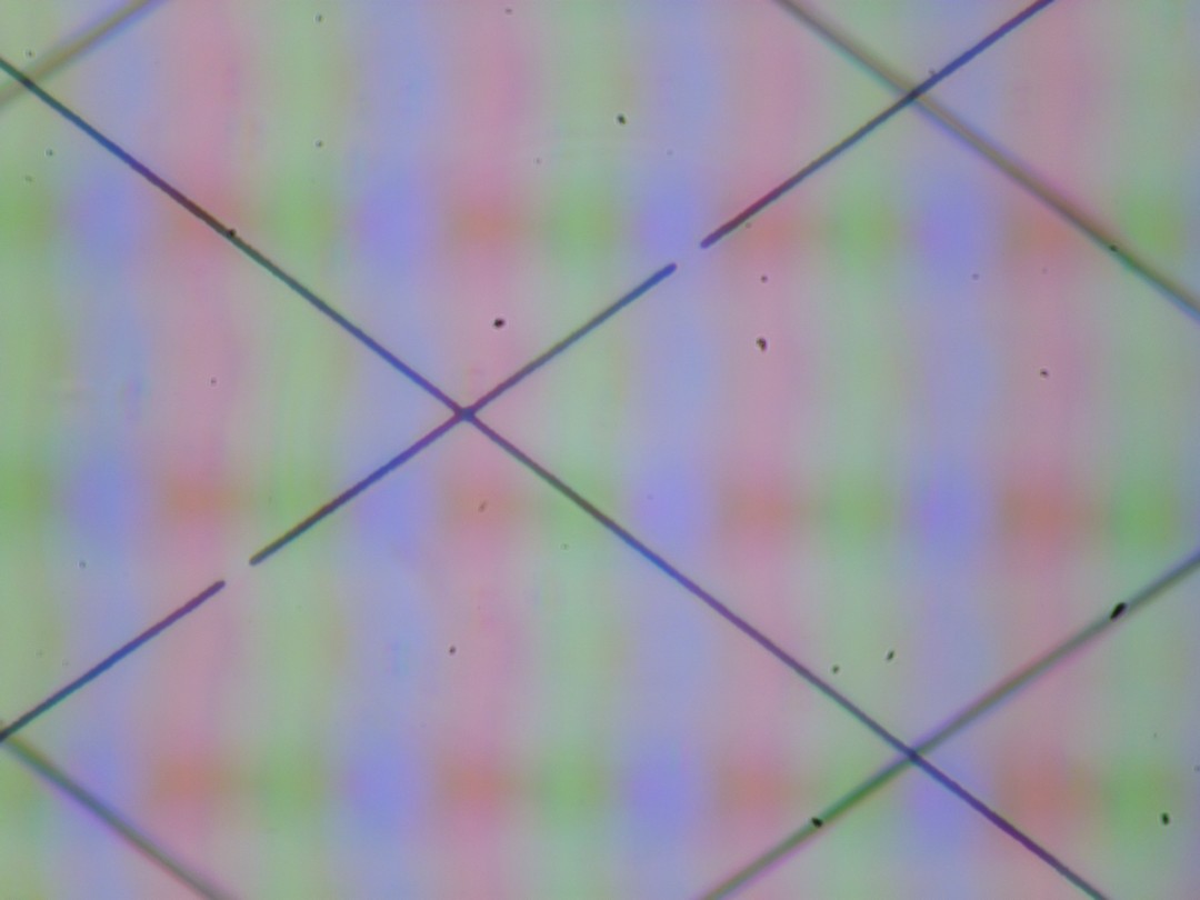 В этом ноутбуке используется матрица типа IPS. Микрофотографии демонстрируют типичную для IPS структуру субпикселей (черные точки — это пыль на матрице фотоаппарата):