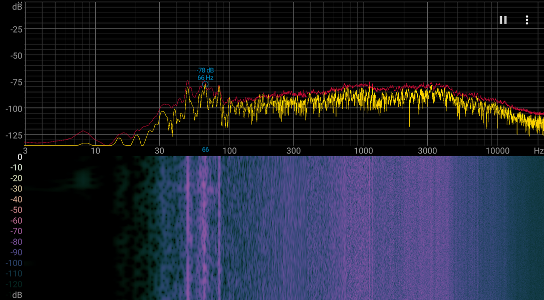 Если ноутбук не нагружать совсем, то его система охлаждения в случае профиля Баланс может работать в пассивном режиме. В этом же профиле даже при большой нагрузке шум от системы охлаждения умеренный. Включение профиля Производительность повышает как одноименную характеристику, так и уровень шума. В любом случае характер шума ровный и раздражения не вызывает. Спектрограмма, полученная для максимальной скорости вентиляторов, достаточно ровная, и в диапазоне частот, где звуки могут вызывать особенное раздражение, выраженных пиков нет: