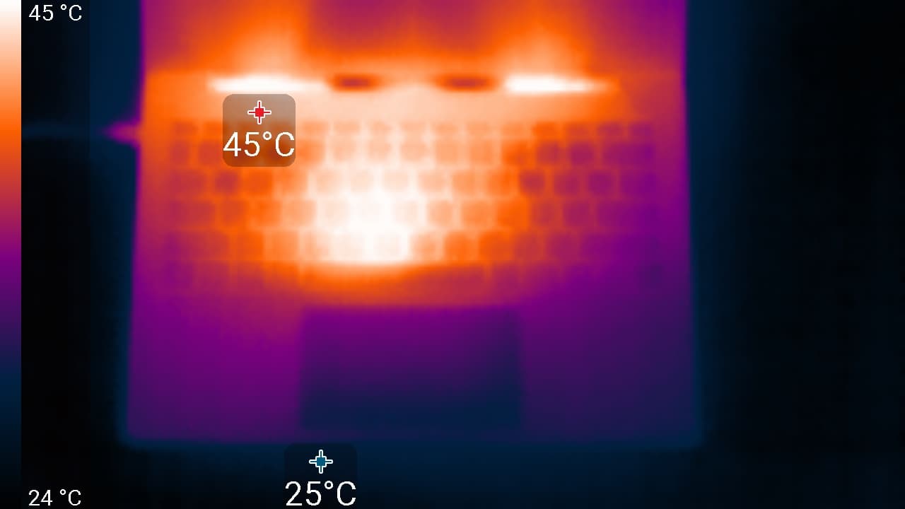 Под максимальной нагрузкой работать с клавиатурой комфортно, так как места под запястьями едва нагреваются. Однако держать ноутбук на коленях неприятно, поскольку колени ощущают нагрев днища ноутбука. Блок питания греется очень сильно, поэтому при долговременной работе с большой производительностью лучше следить, чтобы он не был ничем накрыт.