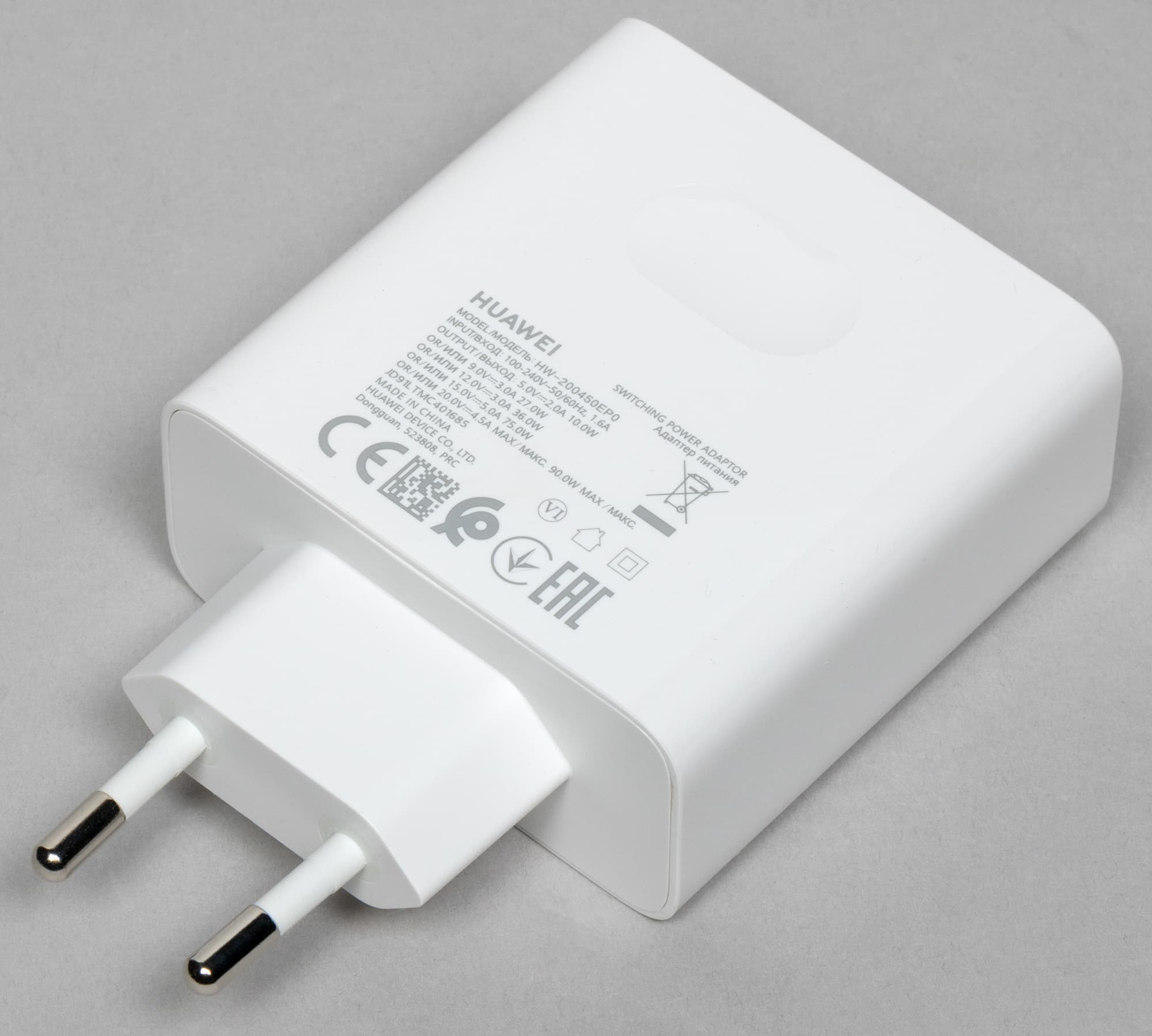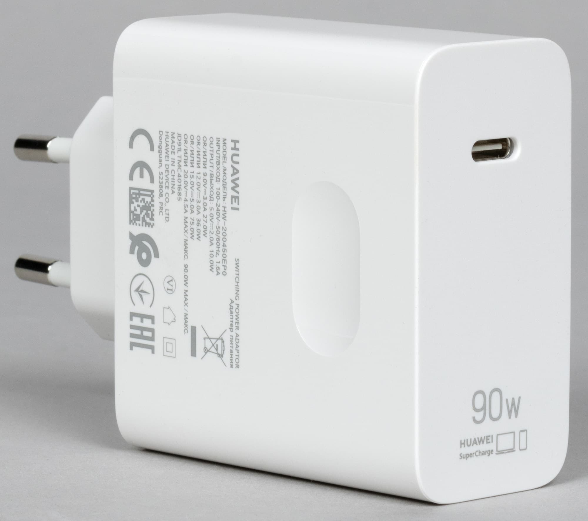 Мощность адаптера питания составляет 90 ватт. Модель адаптера HW-200450EP0 имеет массу 188 граммов и комплектуется отдельным кабелем USB Type-C длиной 1,76 метра.