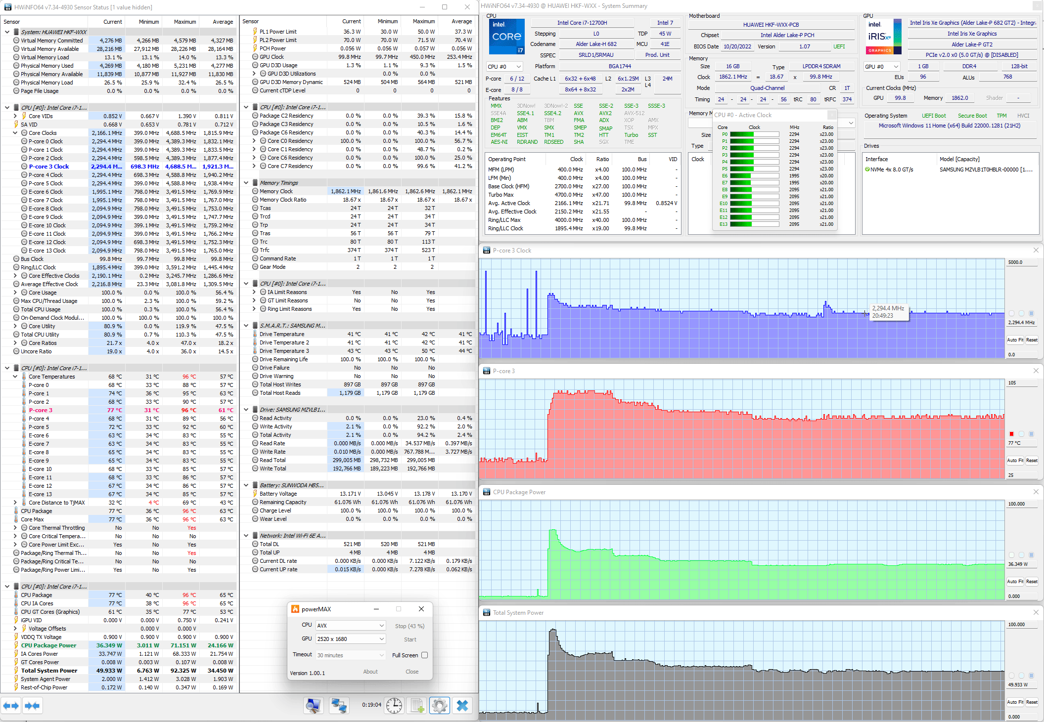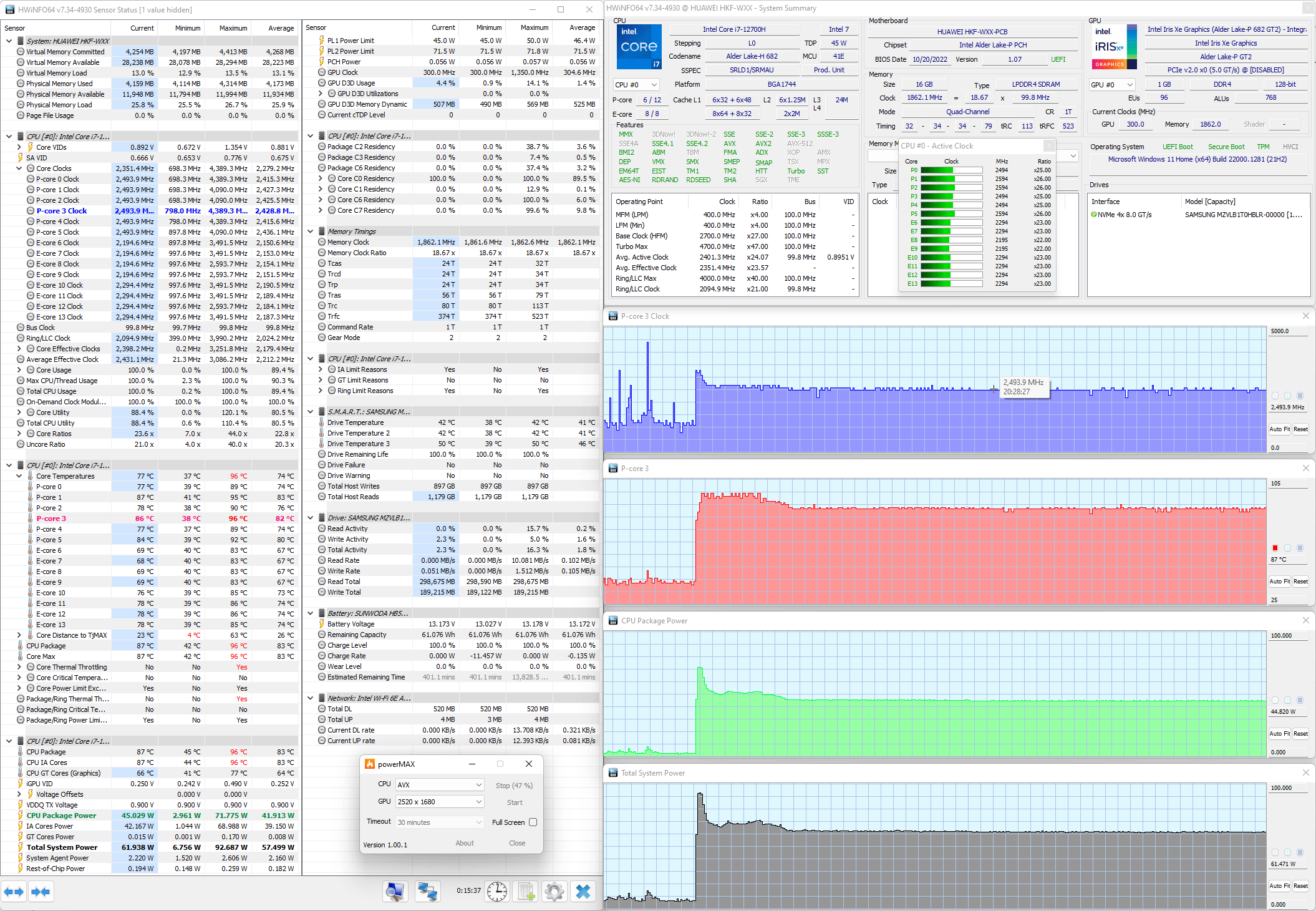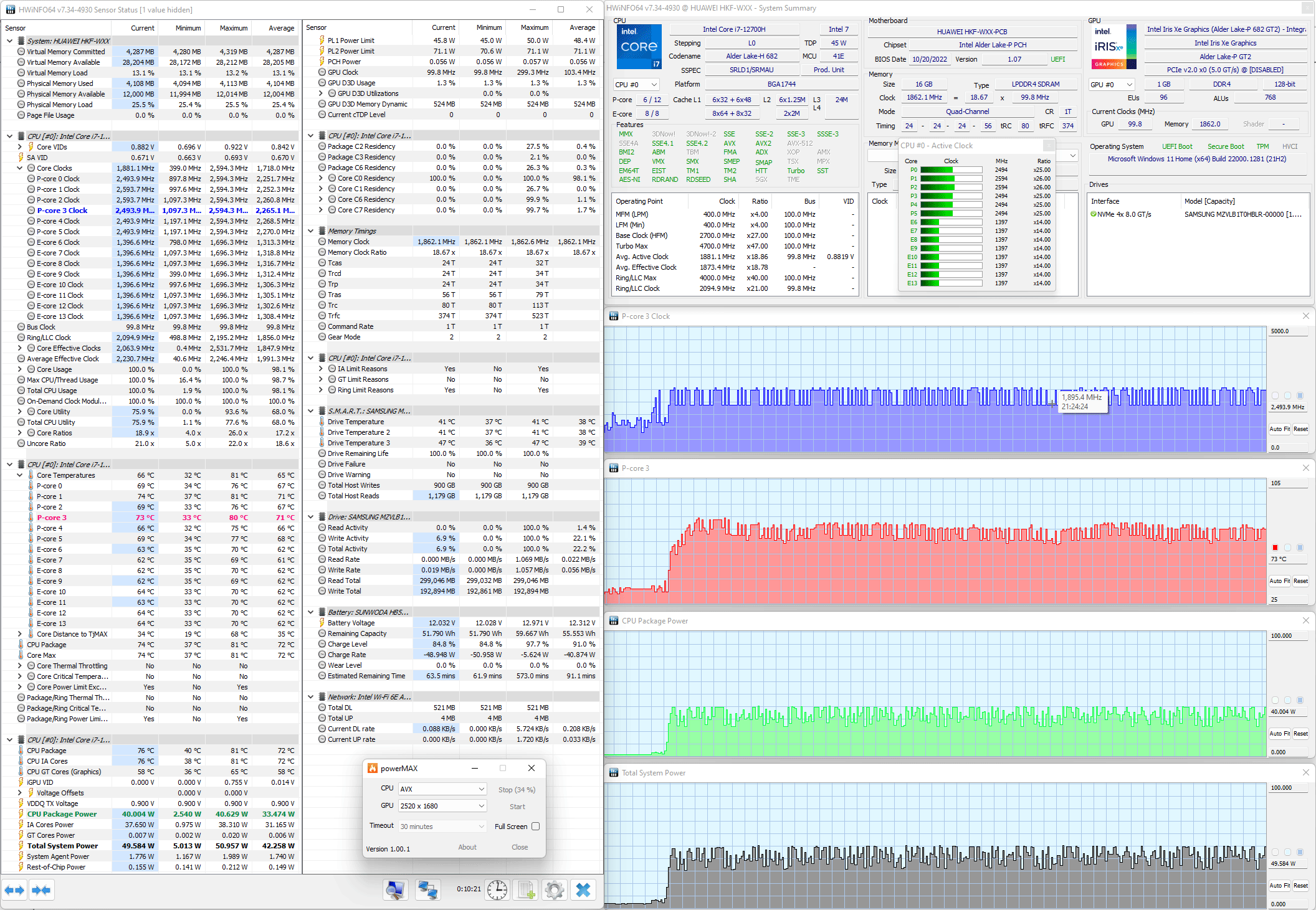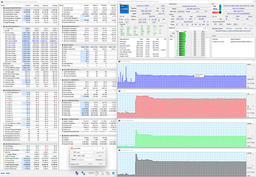 Мы протестировали Huawei MateBook 14s (HKF-X) и его систему охлаждения в стресс-тесте powerMax (с использованием AVX-инструкций) при питании от комплектного адаптера в двух режимах настроек, получив следующие результаты.