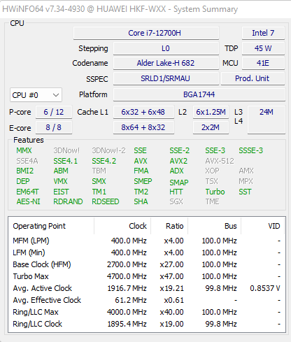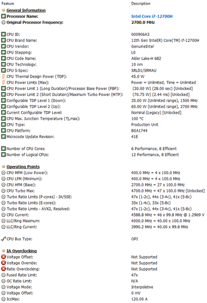 | Центральный процессор | Соге i7-12700H (6 P-ядер/12 потоков до 4,7 ГГц + 8 E-ядер до 3,5 ГГц, L3-кеш 24 МБ, TDP 35—115 Вт) | |