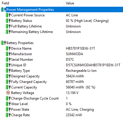 Huawei MateBook 14s (HKF-X) полностью заряжается за 2 часа и 24 минуты (по результатам четырех полных циклов заряда). Первые 60% накапливаются менее чем за час.