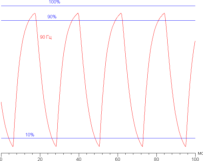 Посмотрим, хватит ли такой скорости матрицы для вывода изображения с частотой 90 Гц. Приведем зависимость яркости от времени при чередовании белого и черного кадра при 90 Гц кадровой частоты: