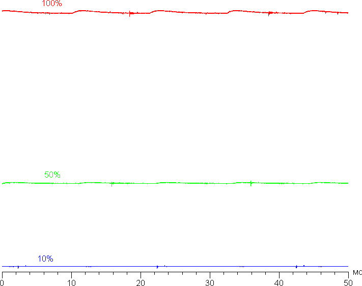 На любом уровне яркости значимая модуляция подсветки отсутствует, поэтому нет и никакого мерцания экрана. В доказательство приведем графики зависимости яркости (вертикальная ось) от времени (горизонтальная ось) при различных значениях настройки яркости: