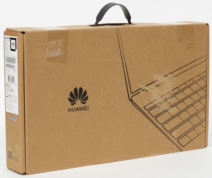Huawei не изменяет упаковкам своих ультрабуков, вот и MateBook 14s 2022 года запечатан в плоскую картонную коробку с пластиковой ручкой и наклейкой на торце.