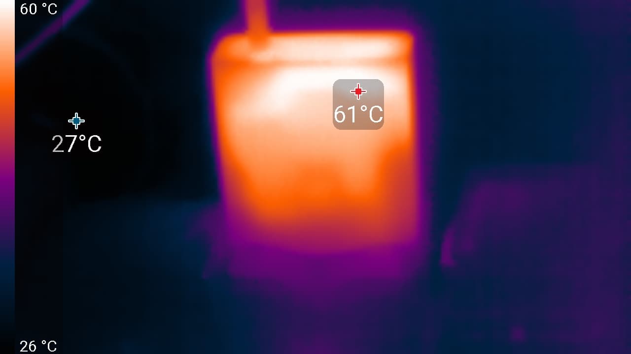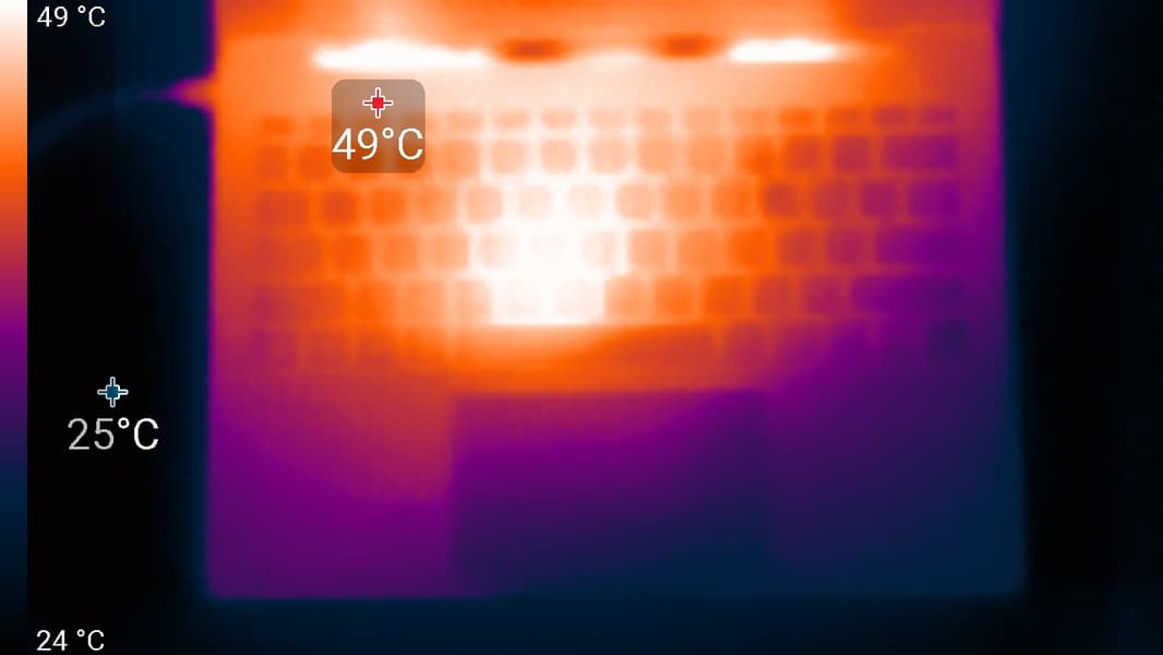 Под максимальной нагрузкой работать с клавиатурой комфортно, так как места под запястьями едва нагреваются. Однако держать ноутбук на коленях неприятно, поскольку колени ощущают нагрев днища ноутбука. Блок питания греется очень сильно, поэтому при долговременной работе с высокой производительностью лучше следить, чтобы он не был ничем накрыт.